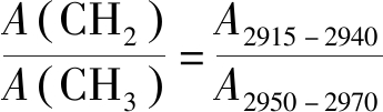 式中:A2915-2940为波数在2 915~2 940 cm-1的CH2不对称伸缩振动面积;A2950-2970为波数在2 940~2 970 cm-1的CH3不对称伸缩振动面积。