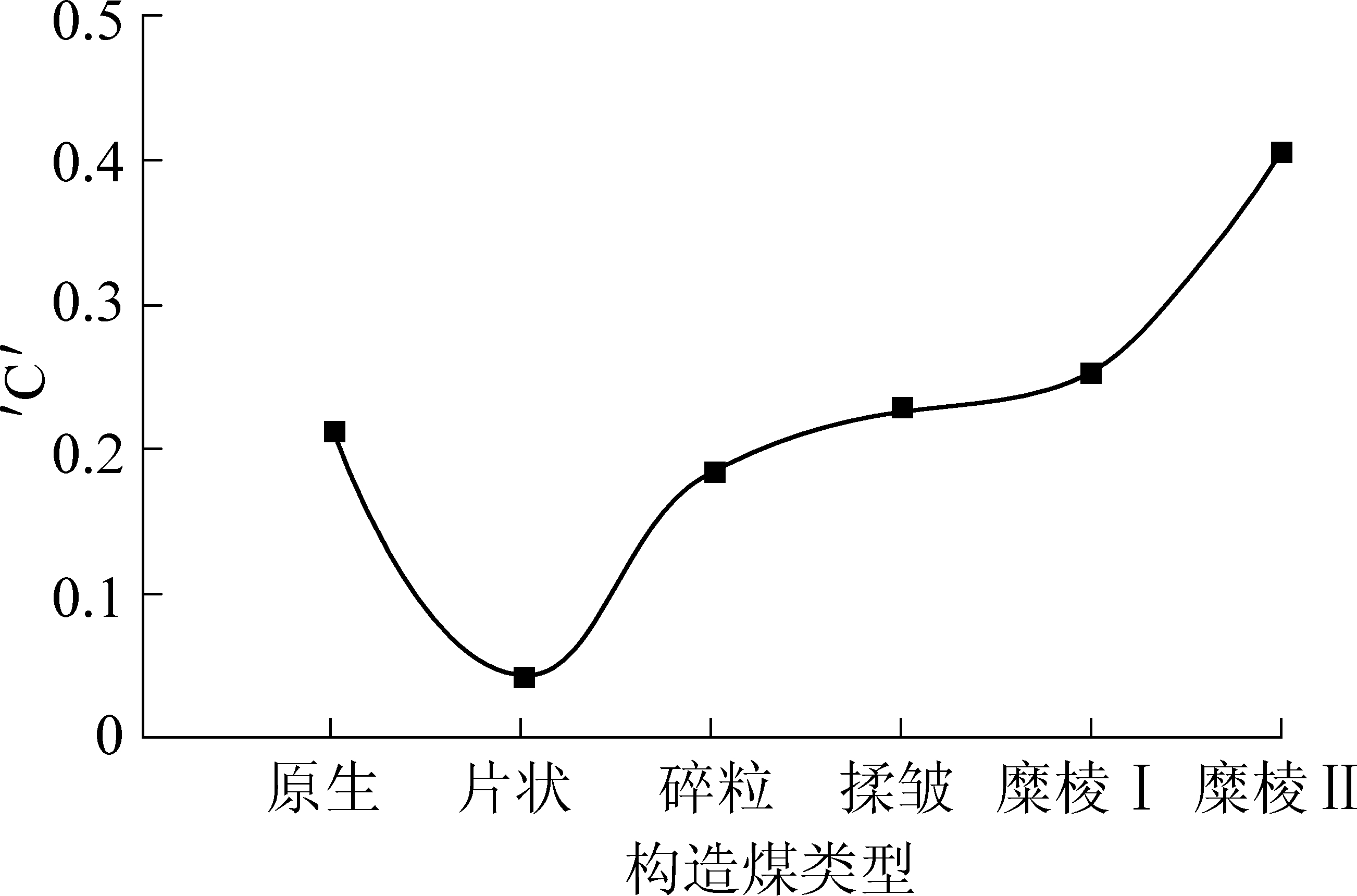 煤中含氧官能团主要分为4类:羟基、羧基、羰基和醚氧[5-6]。羟基吸收峰在波数3 100—3 691 cm-1之间,其红外谱图清晰稳定,含量较高,随构造变动不明显。1 700 cm-1处的羧基和1 200 cm-1为醚的C—O伸缩振动,本次试验所得图谱中吸收峰均较弱或不可见。用′C′表示煤的成熟度(式(7)),从1号原生结构煤到6号糜棱煤Ⅱ其值分别为0.24、0.21、0.08、0.25、0.27、0.41(图7)。随构造应力的增加C