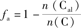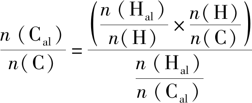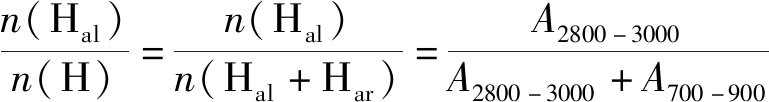 式中:n(Hal)/n(H)为脂肪氢和总氢原子的比值;n(H)为波数在2 800~3 000 cm-1的脂肪氢(Hal)和吸光度在700~900 cm-1的芳香氢(Har)面积之和。n(Cal)/n(C)为脂肪碳的比例;n(H)/n(C)是氢原子与碳原子的比值,由最终分析计算得到;n(Hal)/n(Cal)为脂肪族中氢和碳的比例,通常为1.8[8, 17]。A700-900为波数在700~900 cm-1的芳香烃面积;A2800-3000为波数在2 800~3 000 cm-1的脂肪烃面积。