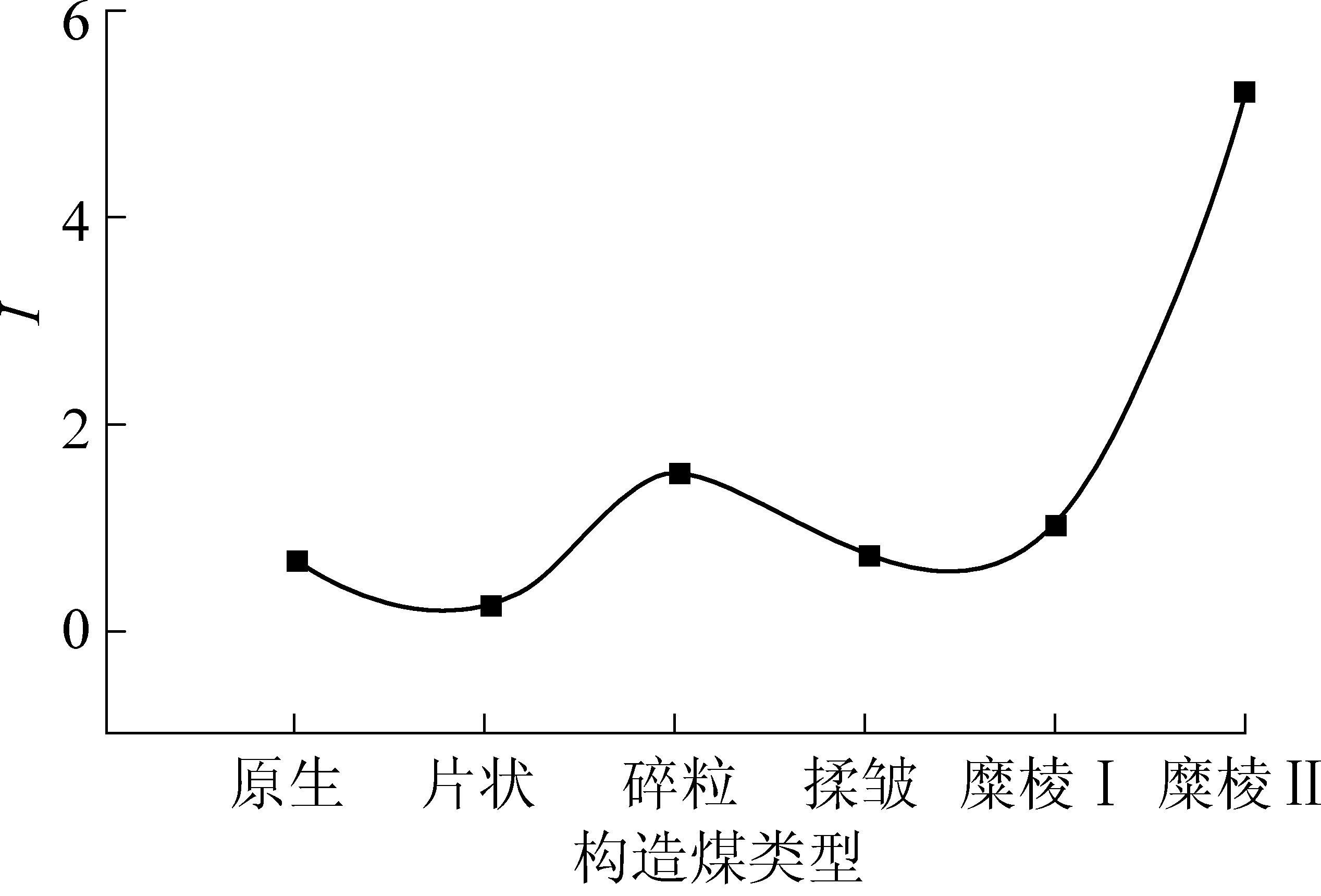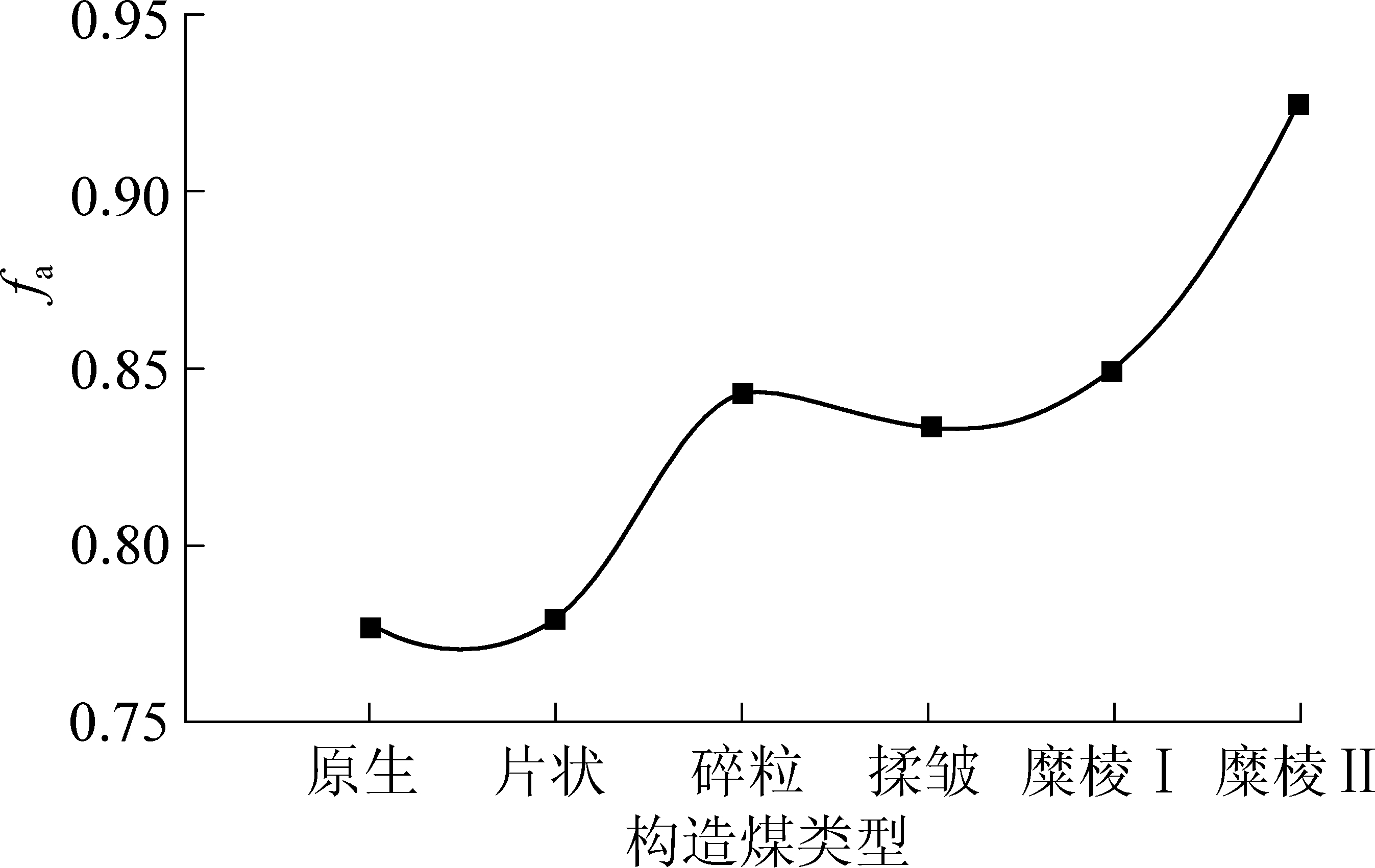 从图3可以明显看出,fa的变化分为脆性变形和韧性变形2个阶段:脆性变形从片状煤到碎粒煤fa增加了0.05,相比于原生结构煤0.79略有增加;韧性变形序列从揉皱煤到糜棱煤中fa随构造应力的增加而迅速增加,且远高于原生结构煤,从糜棱煤Ⅰ到糜棱煤Ⅱ表观芳香度fa增加幅度最大为0.06,说明韧性变形的增加,糜棱化程度得以加深的同时导致了芳环的形成。根据曹代勇等[11]提出的应力缩聚效应,结合试验结果,得出韧性变形环境更有利于小分子物质缩聚成芳环。