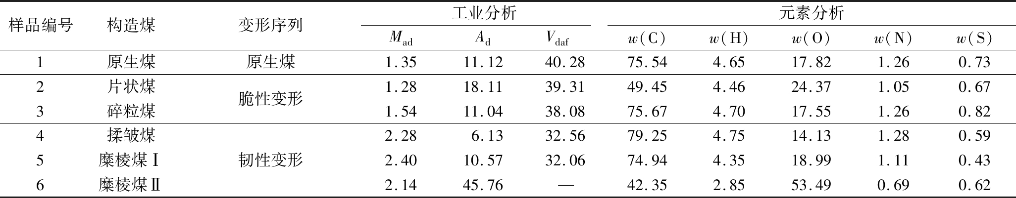 样品编号构造煤变形序列工业分析元素分析MadAdVdafw(C)w(H)w(O)w(N)w(S)1原生煤原生煤1.3511.1240.2875.544.6517.821.260.732片状煤3碎粒煤脆性变形1.2818.1139.3149.454.4624.371.050.671.5411.0438.0875.674.7017.551.260.824揉皱煤5糜棱煤Ⅰ6糜棱煤Ⅱ韧性变形2.286.1332.5679.254.7514.131.280.592.4010.5732.0674.944.3518.991.110.432.1445.76—42.352.8553.490.690.62