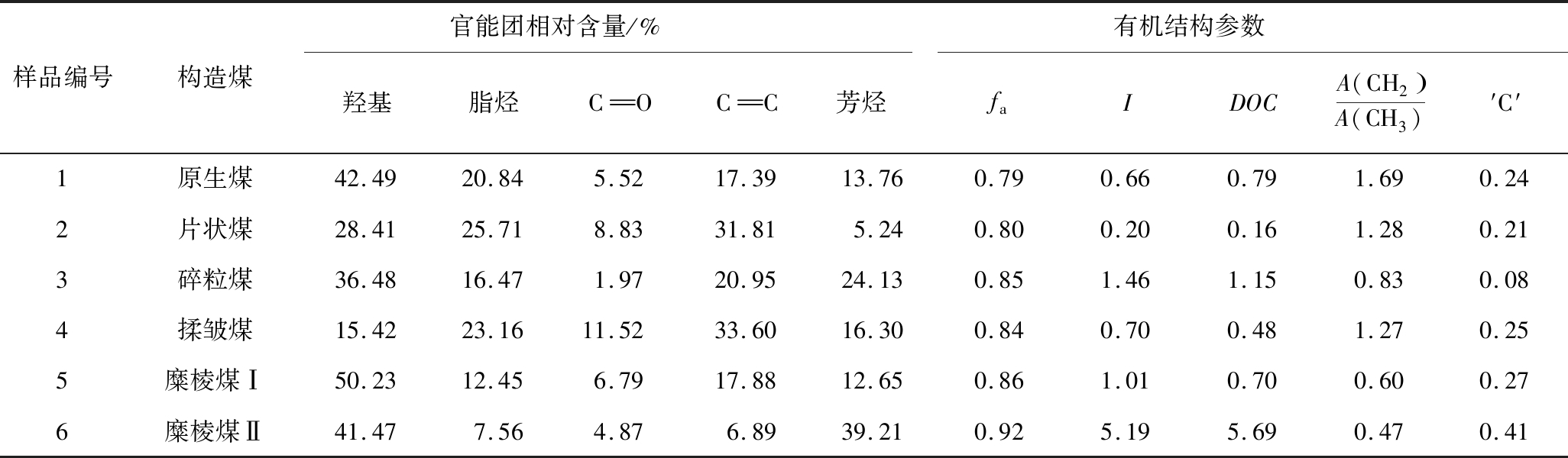 表2 不同构造煤中官能团相对含量及有机结构参数