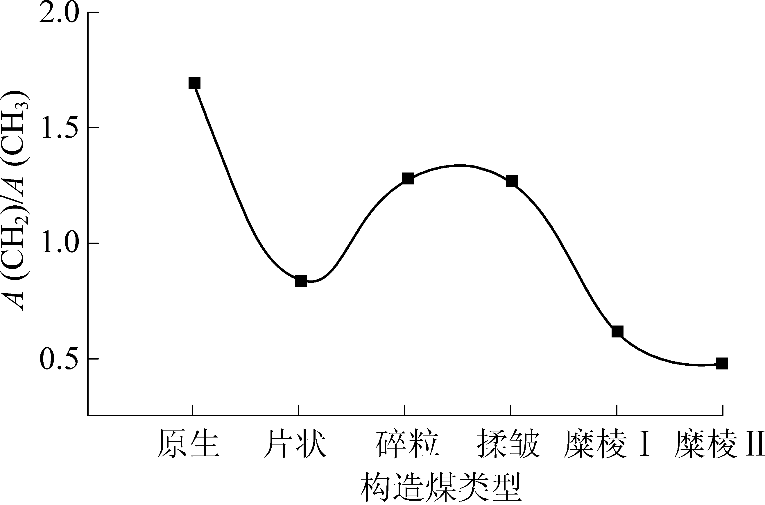 脆性变形阶段表现为缓慢增加的过程,韧性变形阶段的2个糜棱煤之间则表现为陡增,进一步说明韧性变形更有利于芳香结构的形成。芳香结构的演化证实了随着构造应力的增加,脂肪结构逐渐减少,构造应力造成了煤中脂肪结构转化的同时促进了小分子结构缩聚成稳定的芳香结构。