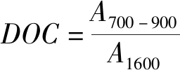 芳香环的浓缩程度用参数DOC表示[8, 18],其值越大表明芳环的浓缩程度越高,公式为