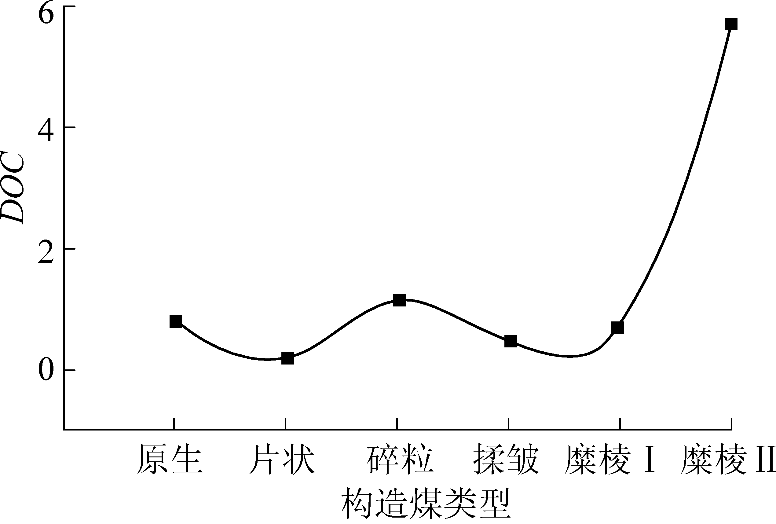 Fig.5 Aromatic rings condensation (DOC)evolution of tectonically deformed coal