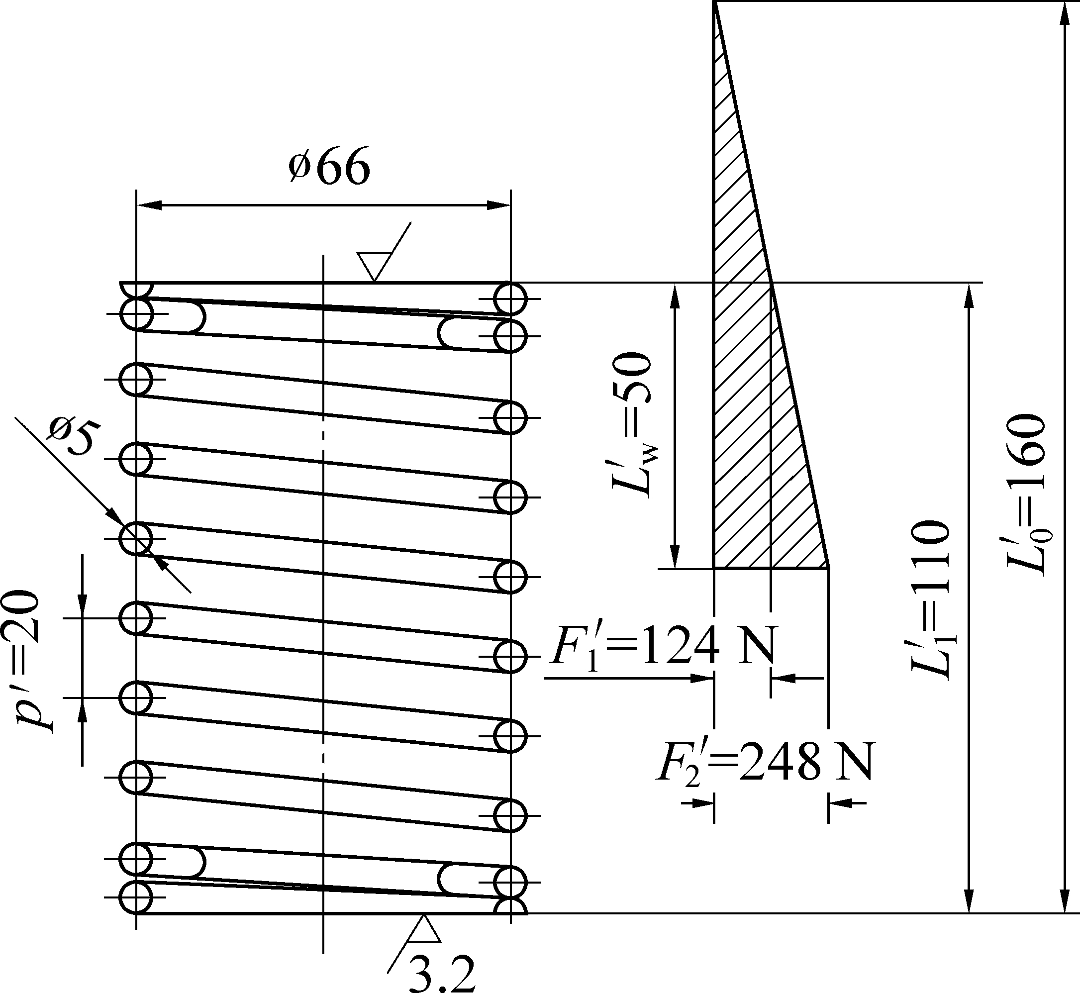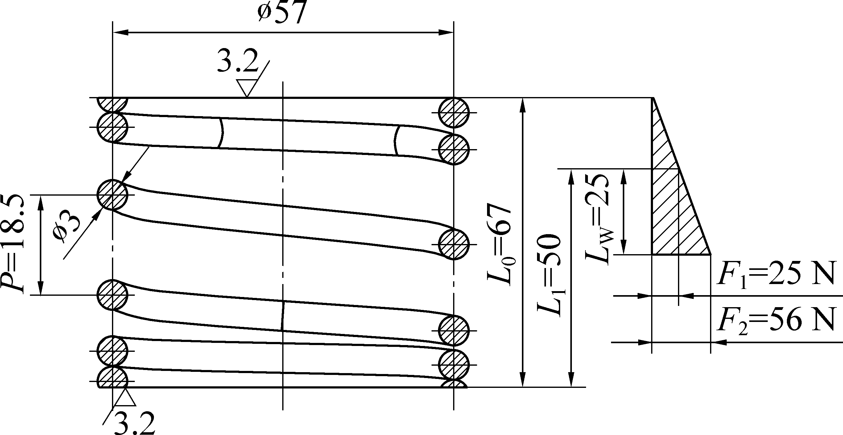 由式(1)―式(15)及相关的校验公式得出的弹簧工作原理如图3所示[21]。技术要求如下:端部形式YJ型,两端并紧,每端磨平3/4圈;压并圈数n1=9.5;有效圈数n=7.5;热处理后硬度45-50HRC;展开长度L为2 006.4 mm。