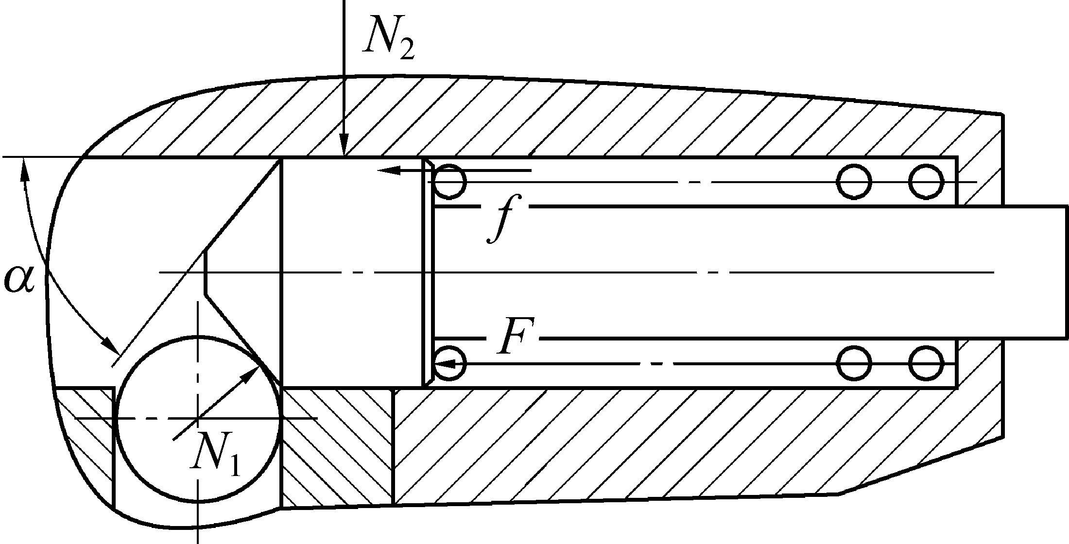 忽略摩擦阻力,控球轴复位过程中,控球轴复位的条件如下:弹簧对控球轴台肩的弹簧力大于钢球对控球轴锥面的作用力在控球轴轴向的分力,即