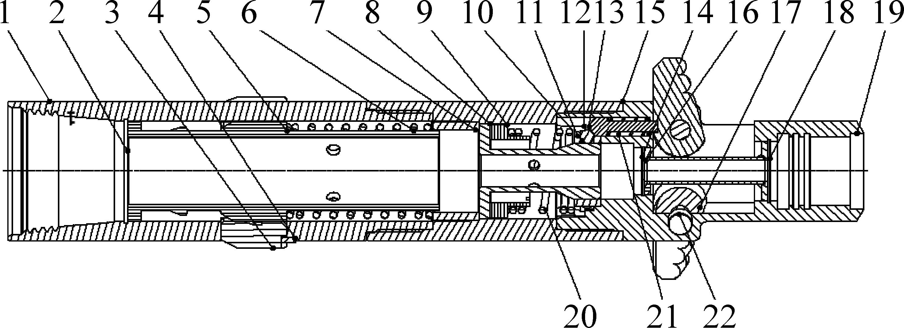 1—下管体;2卡簧Ⅰ;3—卡块;4—挡块;5—芯轴;6—芯轴复位弹簧; 7—导向套;8—控球轴;9—弹簧座;10—钢球;11—保持架;12—压盖; 13—顶杆;14—卡簧Ⅱ;15—中间管体;16—水管;17—切削翼;18—卡 簧Ⅲ;19—上管体;20—控球轴复位弹簧;21—顶杆复位弹簧;22—销轴