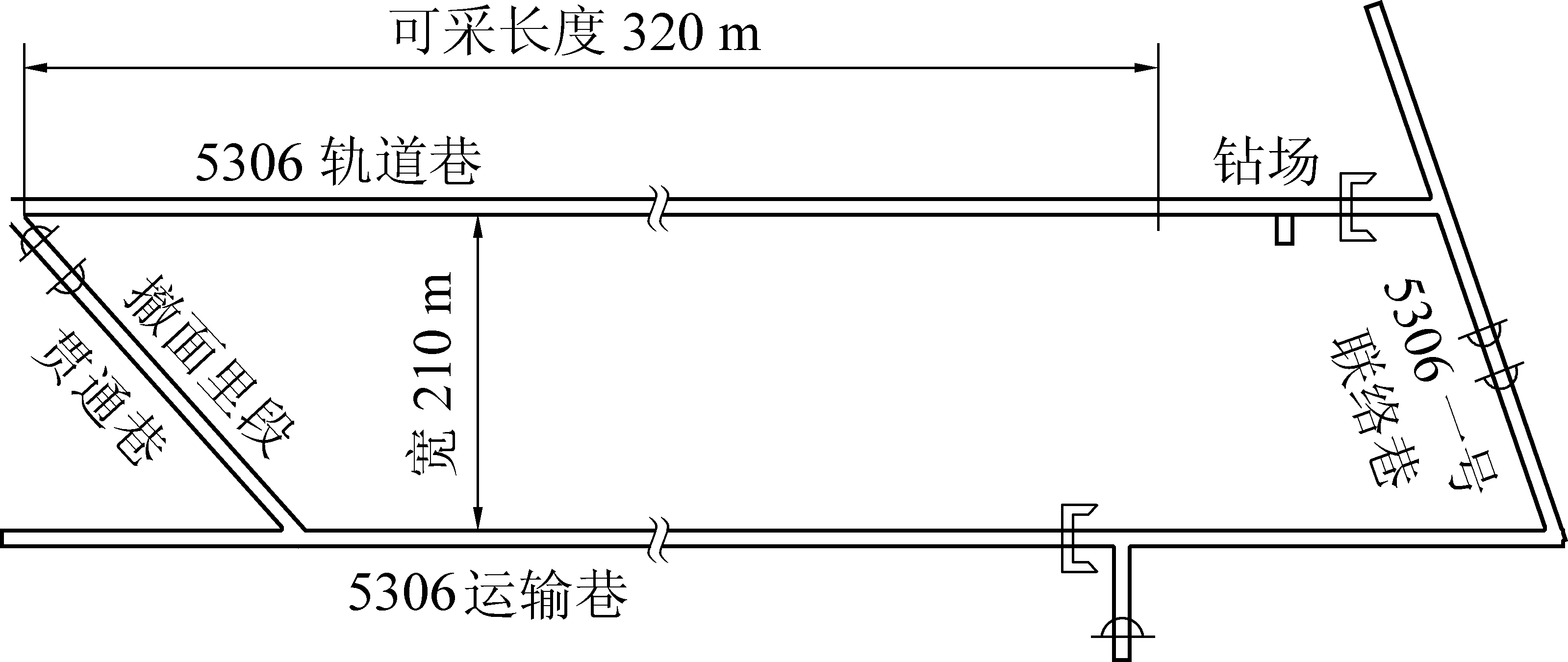 按照上述要求制造的可提式扩孔钻头如图8所示,该钻头在山东济南唐口煤矿5306工作面进行了改进后试用。5306工作面布置如图9所示,该工作面撤面里段净宽210 m,1号联络巷到贯通位置可采长度320 m。回采煤层为3煤,煤层厚度9.1~11.1 m,平均10.08 m,受断层及小褶曲影响,煤层起伏较大,煤层倾角0°~7°,平均3°,倾向角110°~270°。