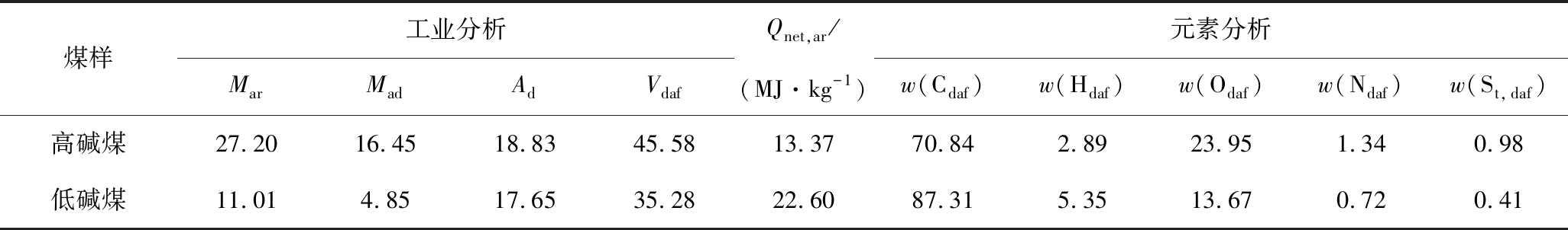 煤样工业分析Qnet,ar/元素分析MarMadAdVdaf(MJ·kg-1)w(Cdaf)w(Hdaf)w(Odaf)w(Ndaf)w(St,daf)高碱煤27.2016.4518.8345.5813.3770.842.8923.951.340.98低碱煤11.014.8517.6535.2822.6087.315.3513.670.720.41