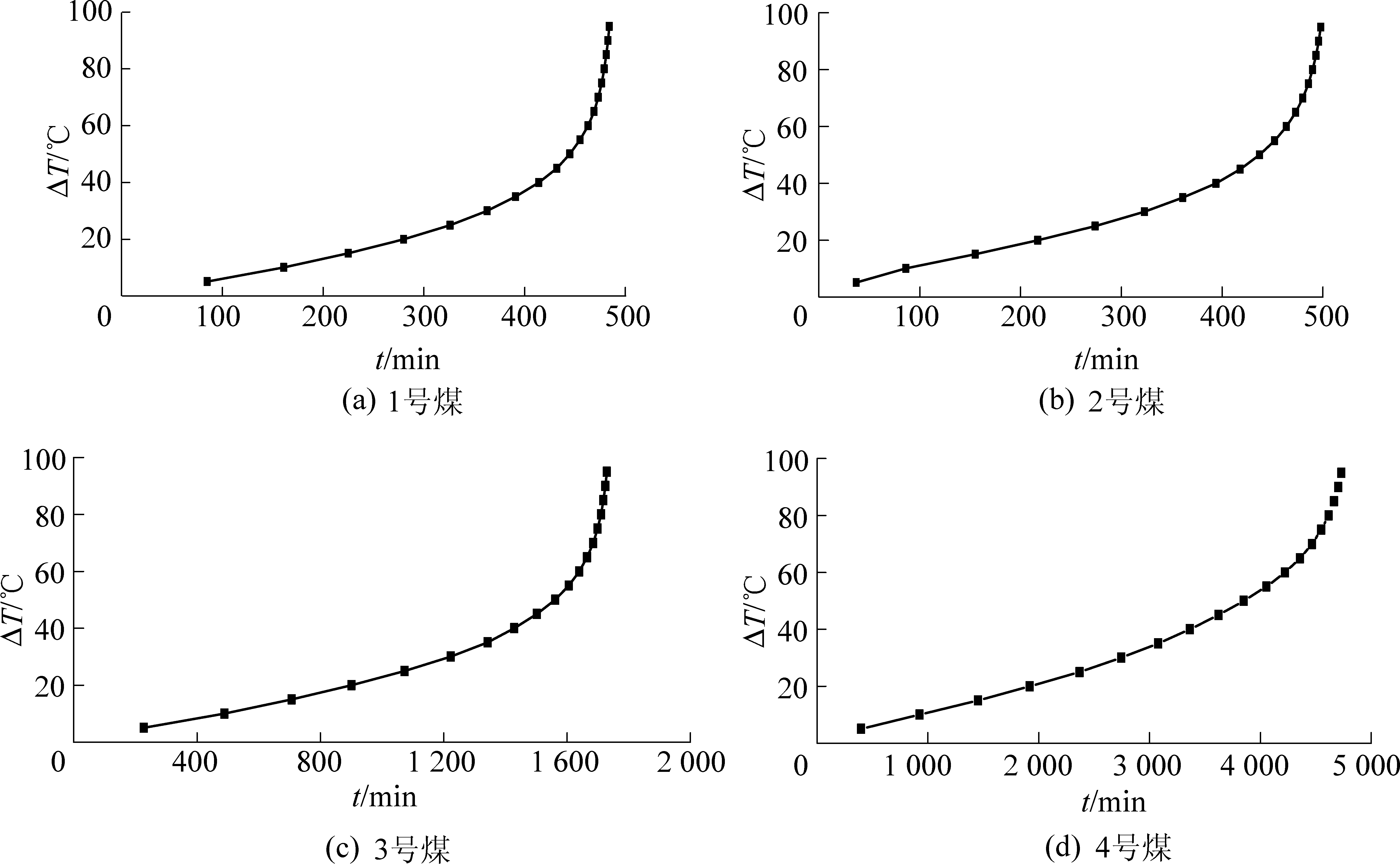 按照上文绝热氧化试验方法对和泰褐煤、荆各庄气煤、兴县气肥煤和常村贫煤(后面简称1号煤、2号煤、3号煤和4号煤)4个煤样进行试验,测定煤样从40~180 ℃的升温过程中温度随时间变化关系,煤样具体参数见表1。为了便于分析和研究,将4个煤样的绝热氧化试验数据以煤温140 ℃为界限,将3组试验中温升量ΔT与时间t的关系分别绘图说明,具体如图2和图3所示。