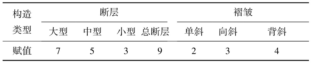 相对熵值的计算主要用于井田已采区内。在计算相对熵值时,共有5个状态量参与计算,即断层总条数、大型断层条数、中型断层条数、小型断层条数以及褶皱类型。单纯的利用断层条数和褶皱个数不能准确反映构造复杂程度,所以要依据断层和褶曲的规模赋值,即权重,进行熵的计算。因为计算后熵值需要相互比较大小,所以赋值时只注重数值的相对大小,不强调其绝对大小,但应遵从的原则是,断层和褶曲规模大的赋值大,反之,赋值小,这样就能大大消除人为赋值对评价结果的影响。按表1的赋值系列给研究区断层和褶曲赋值。