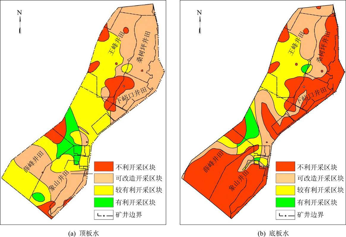 3)根据第2步的划分出的有利区块,在叠加矿井水害危险性时,将矿井水分为顶板水和底板水。叠加顶板水害危险性时,将富水的区域作为可改造区块,将中等富水的区域作为较有利区块,将少水的区域作为有利区块。叠加底板水害危险性时,将危险的区域作为不利区块,将中等危险的区域作为可改造区块,将相对安全的区域作为有利区块。