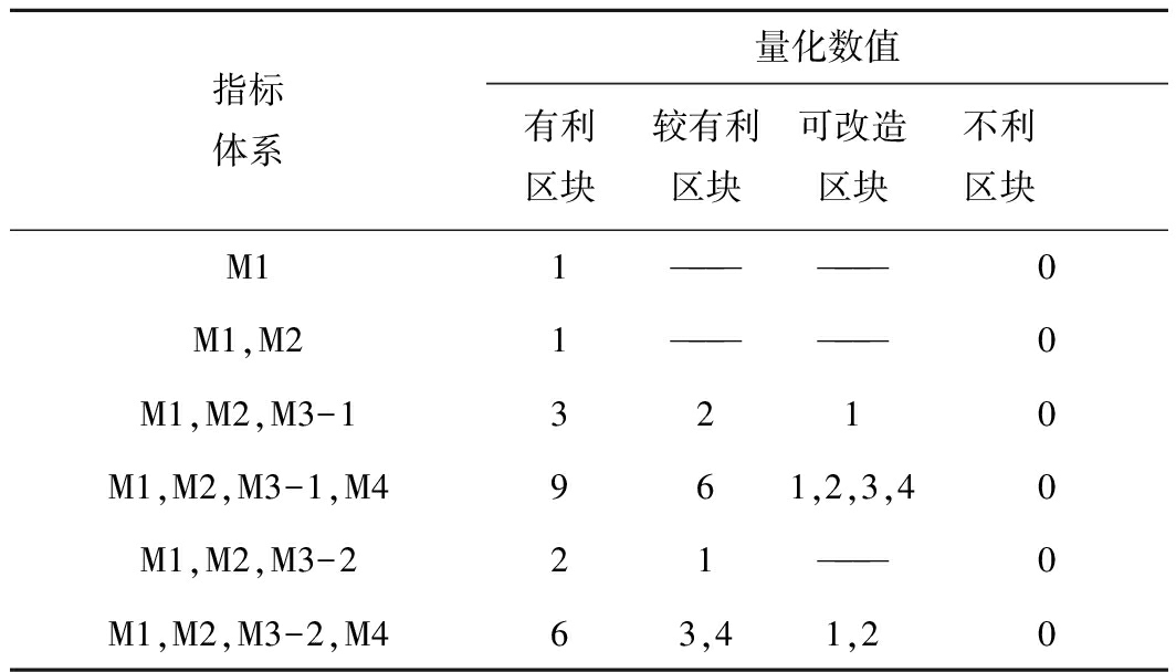 指标体系量化数值有利区块较有利区块可改造区块不利区块M11——————0M1,M21——————0M1,M2,M3-13210M1,M2,M3-1,M4961,2,3,40M1,M2,M3-221———0M1,M2,M3-2,M463,41,20