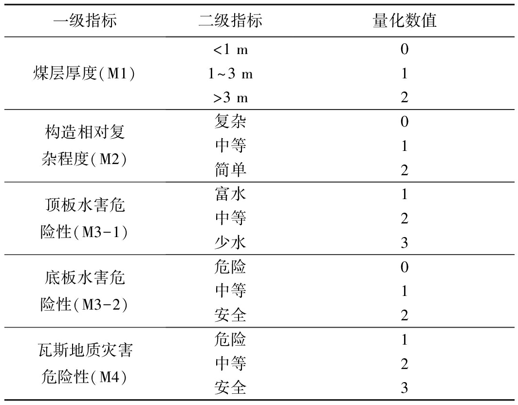 一级指标二级指标量化数值煤层厚度(M1)<1 m1~3 m>3 m012构造相对复杂程度(M2)复杂中等简单012顶板水害危险性(M3-1)富水1中等2少水3底板水害危险性(M3-2)危险0中等1安全2瓦斯地质灾害危险性(M4)危险1中等2安全3