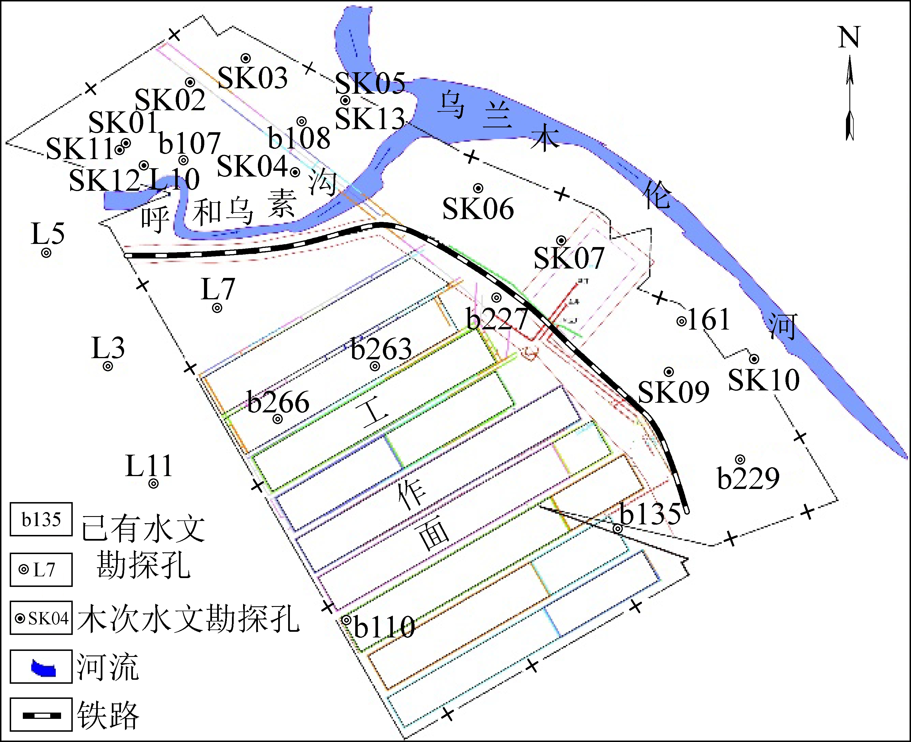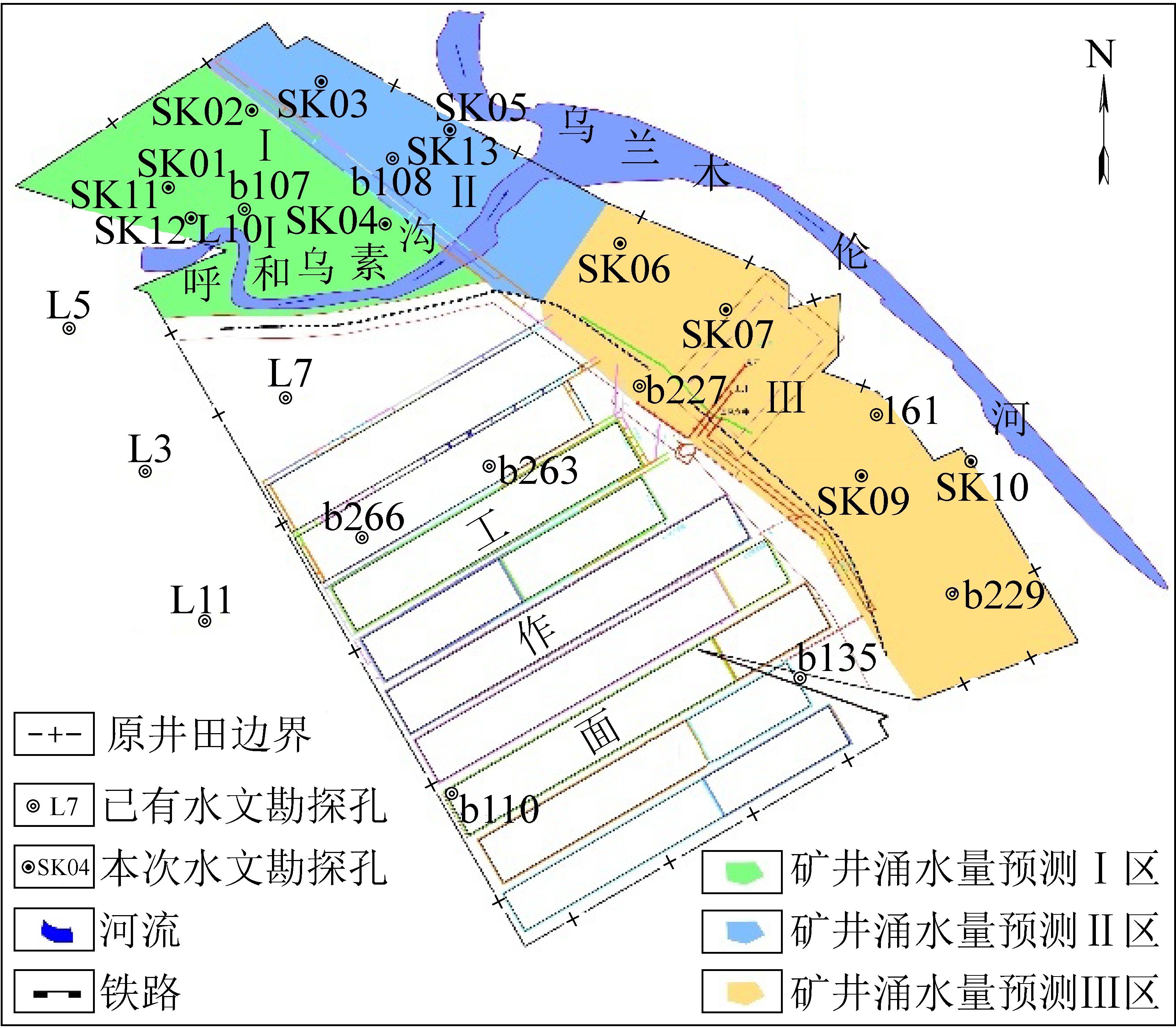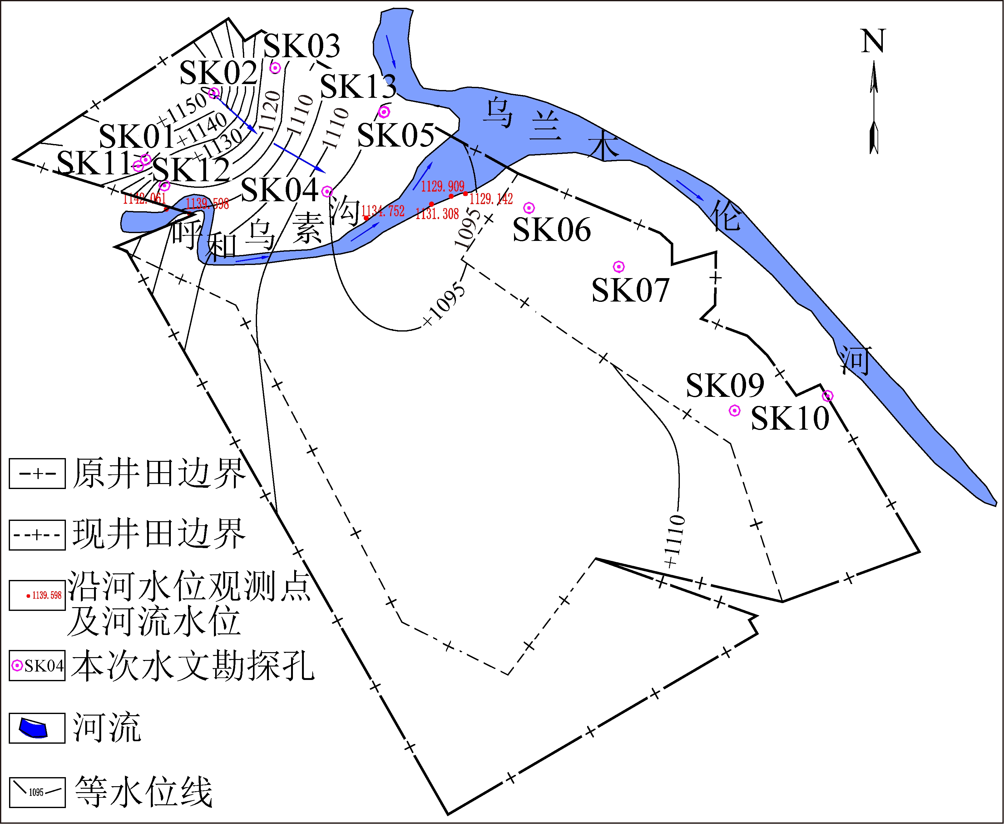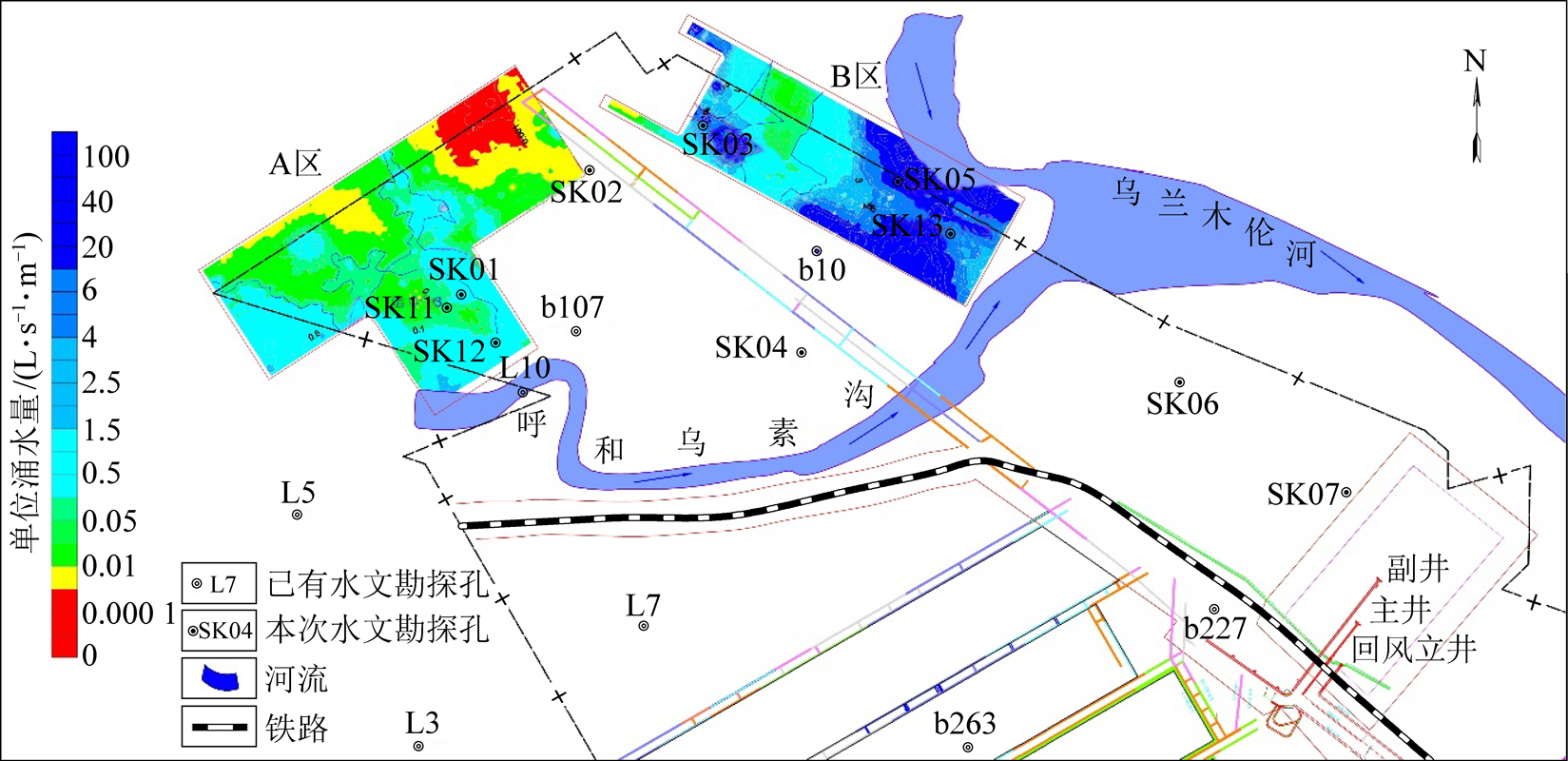 用抽水试验成果绘制矿井等水位线,如图2所示,从表1及图2中得知:靠近乌兰木伦河的SK13号钻孔的单位涌水量与远离河流的SK02、SK03、SK04等钻孔的单位涌水量相差上千倍,表现出含水