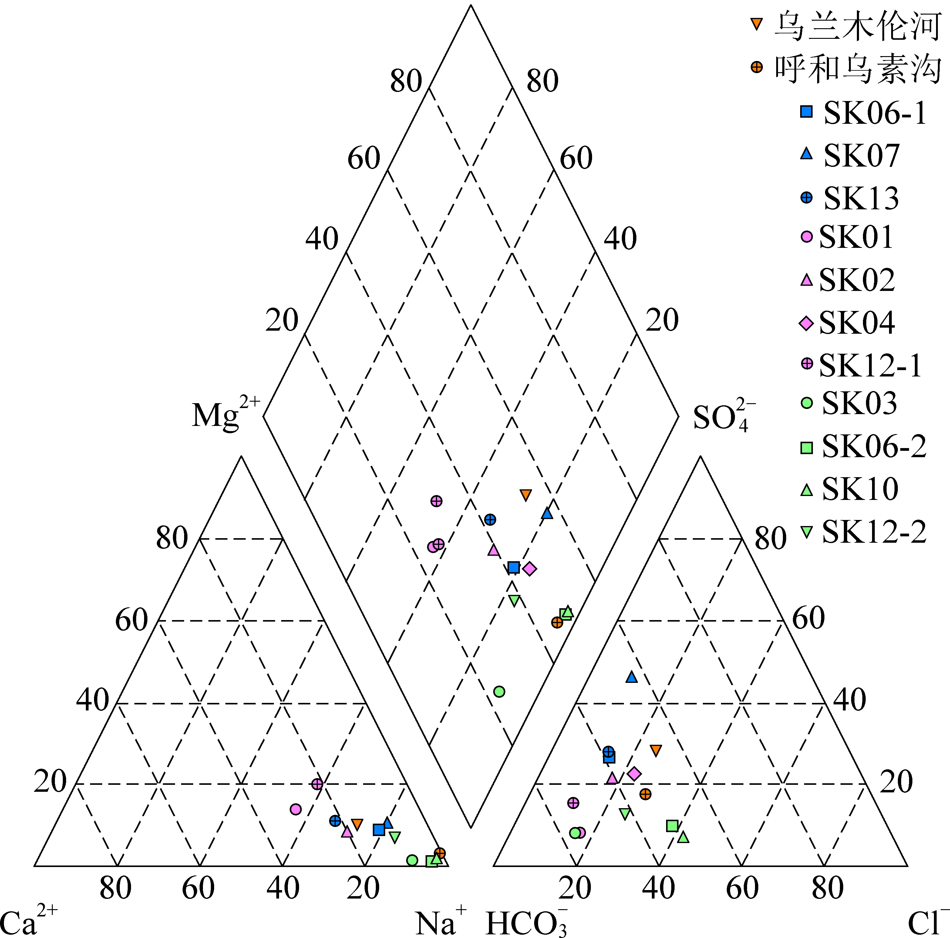 图5 综合水化学Piper三线图
