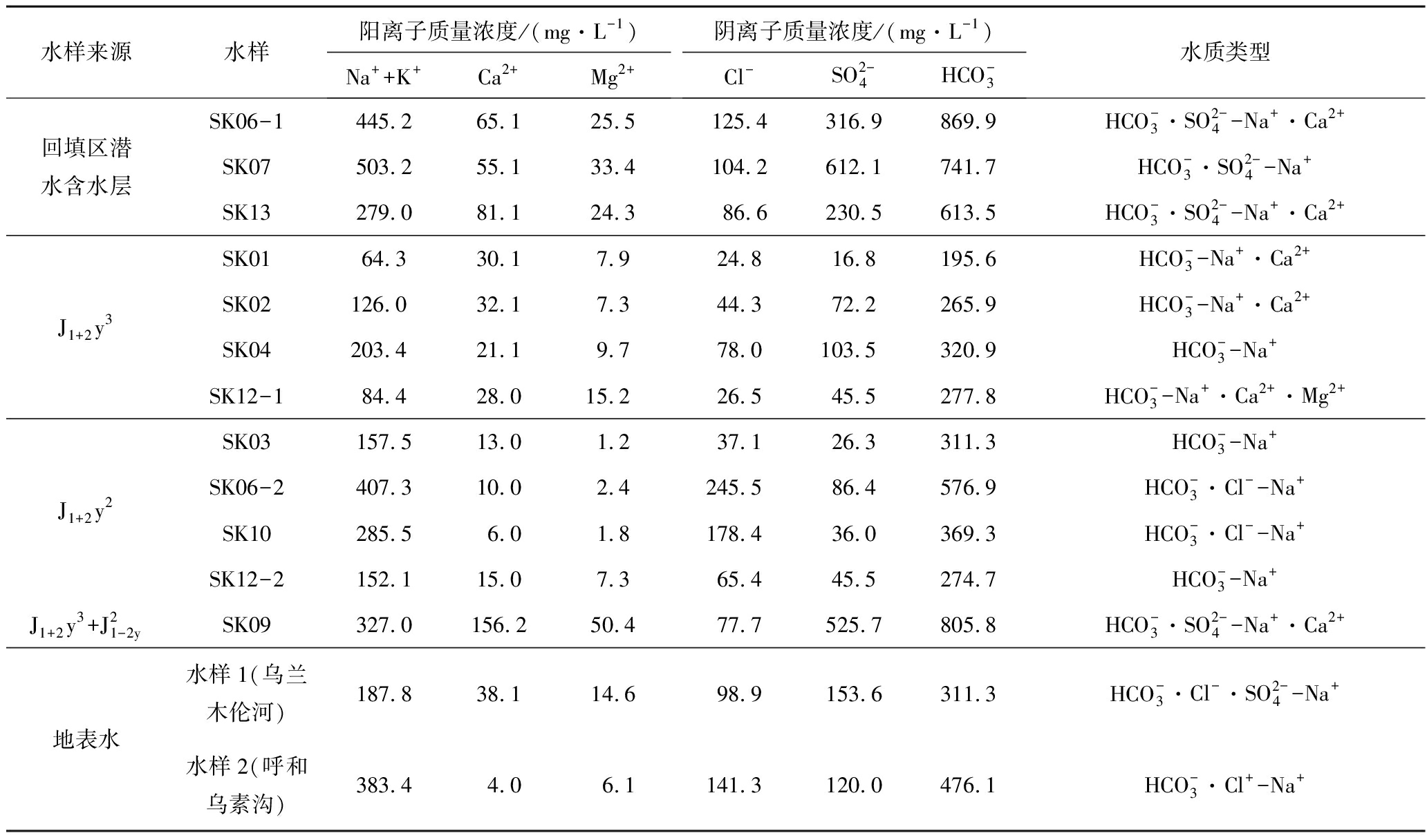水样来源水样阳离子质量浓度/(mg·L-1)Na++K+Ca2+Mg2+阴离子质量浓度/(mg·L-1)Cl-SO2-4HCO-3水质类型回填区潜水含水层SK06-1445.265.125.5125.4316.9869.9HCO-3·SO2-4-Na+·Ca2+SK07503.255.133.4104.2612.1741.7HCO-3·SO2-4-Na+SK13279.081.124.386.6230.5613.5HCO-3·SO2-4-Na+·Ca2+J1+2y3SK0164.330.17.924.816.8195.6HCO-3-Na+·Ca2+SK02126.032.17.344.372.2265.9HCO-3-Na+·Ca2+SK04203.421.19.778.0103.5320.9HCO-3-Na+SK12-184.428.015.226.545.5277.8HCO-3-Na+·Ca2+·Mg2+J1+2y2SK03157.513.01.237.126.3311.3HCO-3-Na+SK06-2407.310.02.4245.586.4576.9HCO-3·Cl--Na+SK10285.56.01.8178.436.0369.3HCO-3·Cl--Na+SK12-2152.115.07.365.445.5274.7HCO-3-Na+J1+2y3+J21-2ySK09327.0156.250.477.7525.7805.8HCO-3·SO2-4-Na+·Ca2+地表水水样1(乌兰木伦河)187.838.114.698.9153.6311.3HCO-3·Cl-·SO2-4-Na+水样2(呼和乌素沟)383.44.06.1141.3120.0476.1HCO-3·Cl+-Na+