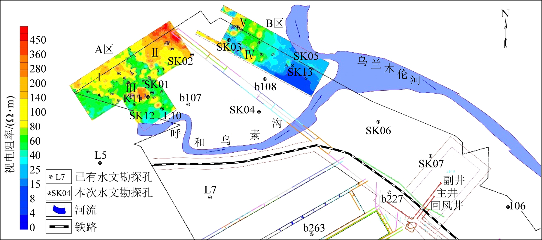 以+1 080 m(3煤层位)为例进行解释,如图6所示,其它层位有类似趋势。图6中A区仅南部边界靠近呼和乌素沟,因此,A区西南部低阻异常范围呈现较少趋势,高阻普遍存在。从西往东远离河流,视电阻率值整体增大,说明富水性较弱(或不含水),且整体阻值从西往东较为均匀,该区内SK01、SK02和SK11均发现存在较大范围采空区,高阻异常推断为不含水或弱含水采空区。图6中B区位于乌兰木伦河与呼和乌素沟交汇处附近,B区东部、南部低阻异常普遍存在。低阻异常范围较大,低阻阻值较低,富水性较强—强,且呈现从西向东靠近河流交汇处,视电阻率值整体降低,B区大部分区域呈现明显低阻异常。