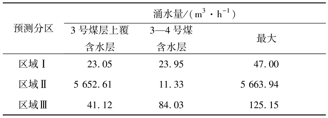 预测分区涌水量/(m3·h-1)3号煤层上覆含水层3—4号煤含水层最大区域Ⅰ23.0523.9547.00区域Ⅱ5 652.6111.335 663.94区域Ⅲ41.1284.03125.15