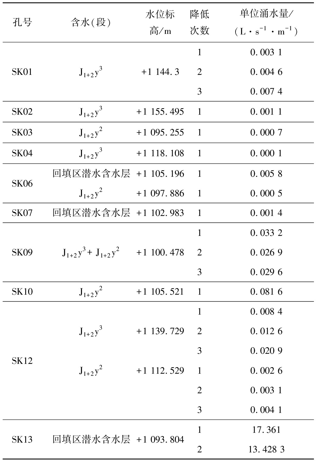孔号含水(段)水位标高/m降低次数单位涌水量/(L·s-1·m-1)SK01J1+2y3+1 144.310.003 120.004 630.007 4SK02J1+2y3+1 155.49510.001 1SK03J1+2y2+1 095.25510.000 7SK04J1+2y3+1 118.10810.000 1SK06回填区潜水含水层+1 105.19610.005 8J1+2y2+1 097.88610.000 5SK07回填区潜水含水层+1 102.98310.001 4SK09J1+2y3+ J1+2y2+1 100.47810.033 220.026 930.029 6SK10J1+2y2+1 105.52110.081 6SK12J1+2y3+1 139.729J1+2y2+1 112.52910.008 420.012 630.020 910.002 620.003 130.004 1SK13回填区潜水含水层+1 093.804117.361213.428 3