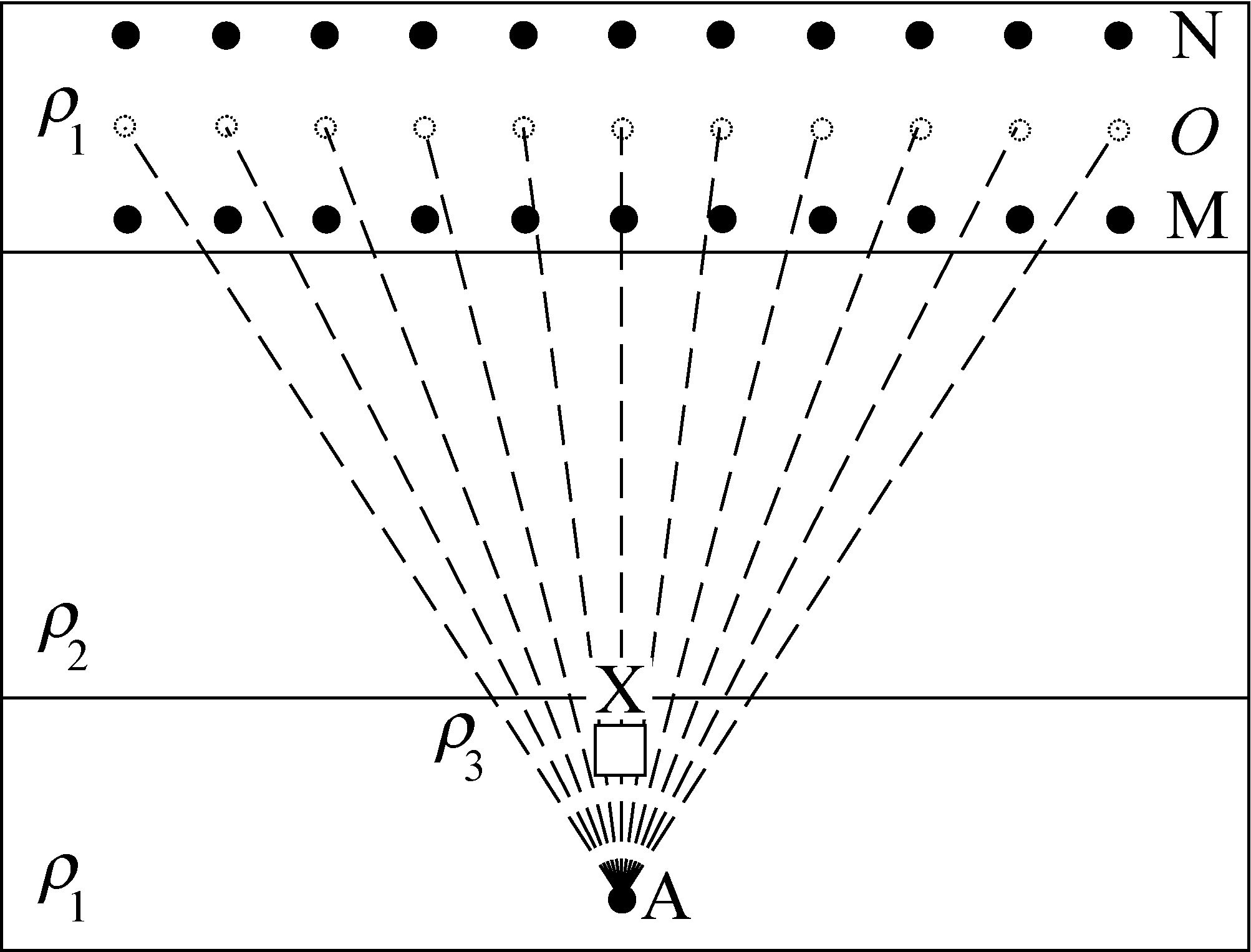 设计水平三层地层地电模型,分别在上平巷布置接收点,接收点电极为M、N;在下平巷布置发射点,发射点电极为A;O为M、N中点位置,即接收电压测量点位置。每组发射电极距为50 m,共设置9组发射电极发射供电电流;每组接收电极之间距离为10 m,每组发射电极对应设置11个接收点。设置工作面宽度300 m,巷道宽度5 m。巷道低阻干扰体位于发射源附近,低阻干扰体主要是巷道锚网支护等低阻干扰体,由于巷道支护贯穿巷道的顶板与侧帮,这里选取对探测结果影响较大的区域(发射电极附近)进行分析,因此设计巷道低电阻率正方形块,低阻干扰体边长为3m,设计施工布置模型,如图2所示。模型中正方形低电阻率体X位于发射电极A附近,接收电极M、N在对面巷道接收。巷道岩层电阻率为ρ1,ρ1=500 Ω·m;工作面煤层电阻率为ρ2,ρ2=2 000 Ω·m;低阻异常体X电阻率为ρ3,ρ3=50 Ω·m。