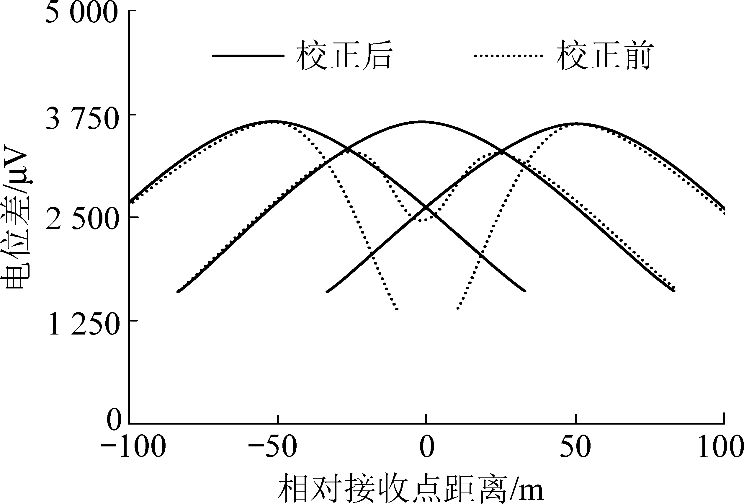 由图10可以看出,校正前由于受到接收端干扰体的影响,干扰体附近数据出现阶跃式畸变,这对数据处理会有较大影响;通过校正使数据符合音频电透视探测的规律。校正后曲线中不存在畸变点干扰造成的异常,表明数据校正效果良好。