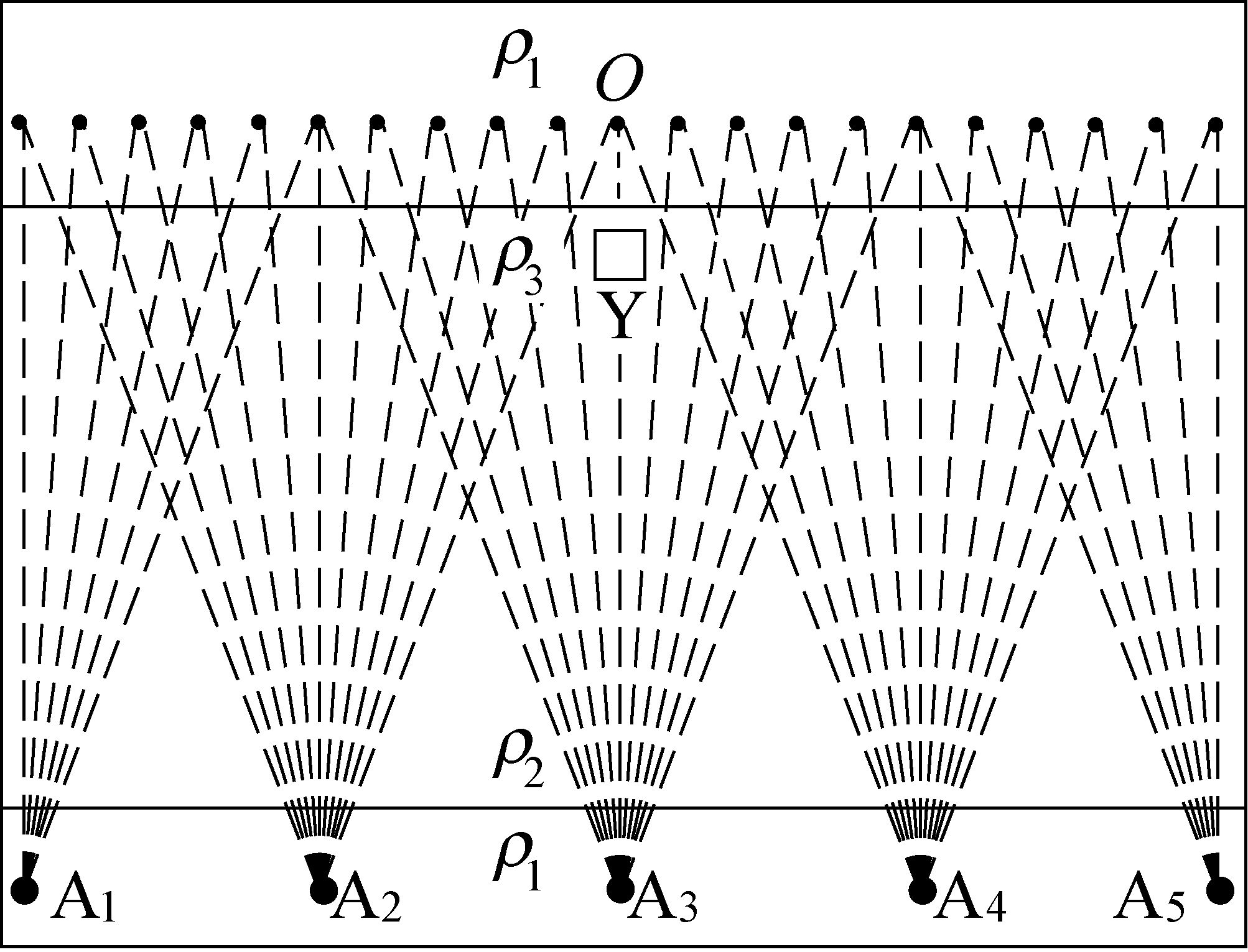 设计水平三层地层地电模型,同样分别在上平巷布置接收点,接收点为O,O为测量电极中点位置,即接收电压测量点位置;在下巷布置发射点,测量电极发射点为A。每组发射电极距为50 m,共设置5组发射电极发射供电电流;每组接收电极之间距离为10 m,每组发射点对应设置11个接收点。设置工作面宽度300 m,巷道宽度5 m。巷道低阻干扰体位于接收源附近,低阻干扰体主要是巷道中的积水等引起的干扰体,由于这种干扰往往不均匀且偶然发生,这里选取接收点附近作为低阻干扰体异常点进行计算。巷道设计低电阻率正方形块,低阻干扰体范围与巷道范围相同,即设计边长为5 m的巷道低阻干扰体,设计施工布置模型,如图4所示。模型中正方形低电阻率体Y位于发射电极A附近,接收电极M、N在对面巷道接收。巷道岩层电阻率为ρ1,ρ1=500 Ω·m;工作面煤层电阻率为ρ2,ρ2=2 000 Ω·m;低阻异常体Y电阻率为ρ3,ρ3=50 Ω·m。