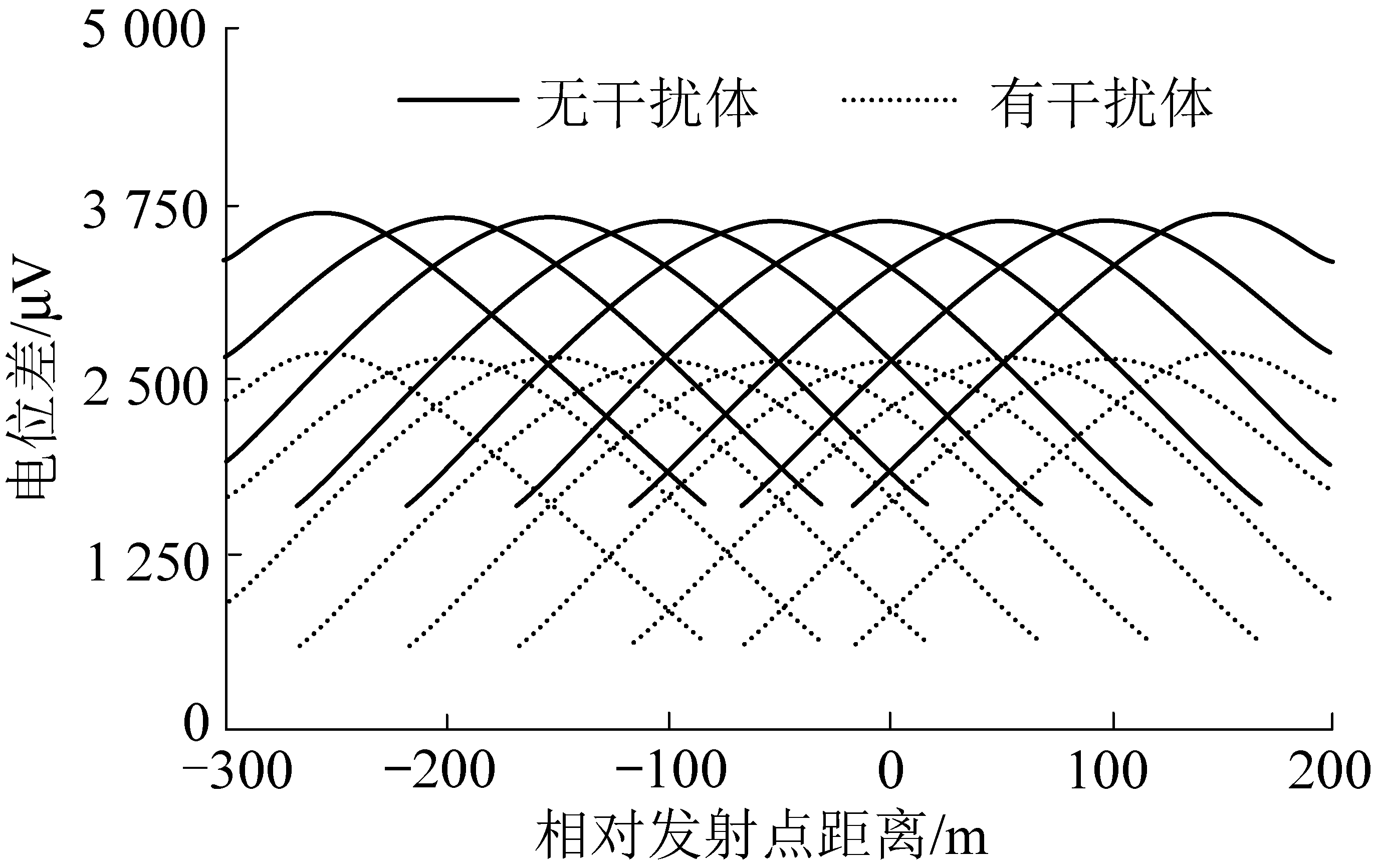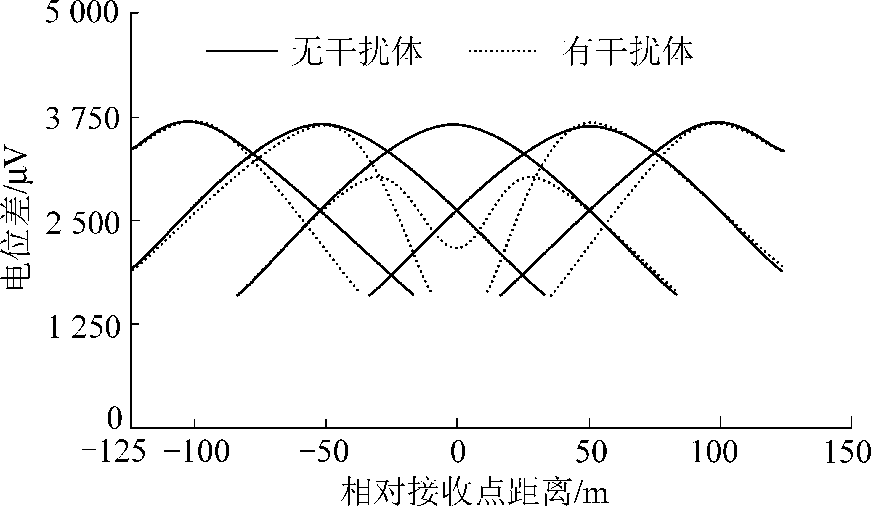 由图3可以看出,当浅部存在和没有低阻干扰体对比时,由于浅部低阻干扰体的存在,使接收到的测量电位差数据偏离真实值。当发射端附近有低阻干扰体时,接收电位差数据呈现整体偏移现象。有干扰体与没有干扰体时测量数据差距较大,造成曲线畸变,对测量结果有比较大的影响。