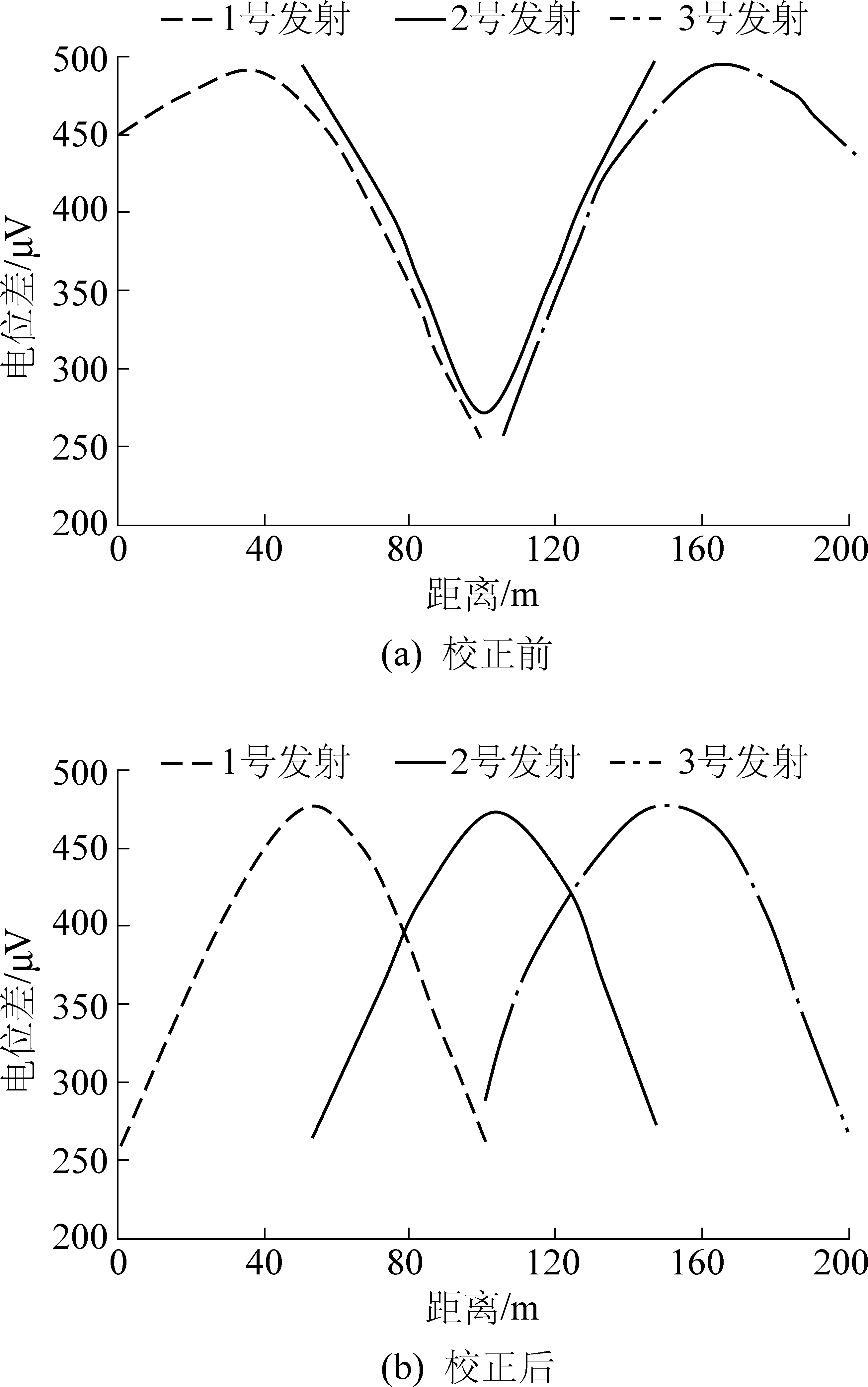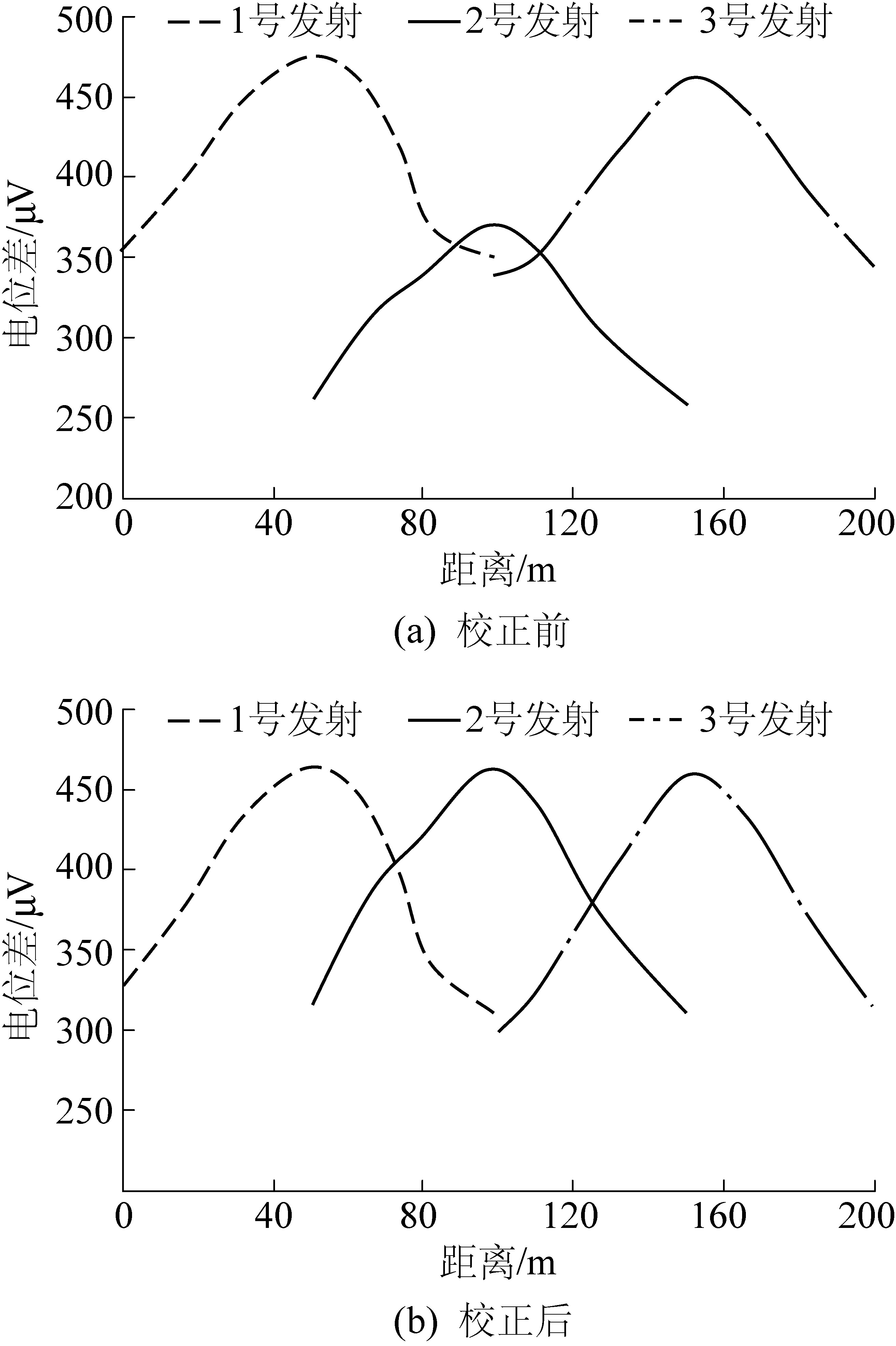 接收端干扰体试验探测距离200 m,探测方法为发射端布置三组发射电极,从左至右分别定为1、2和3号发射电极。对面巷道每组发射电极对应布设11组接收电极接收信号。其中在2号发射电极对应巷道接收位置布设低阻干扰体,低阻干扰体位于100 m位置。通过对原始电位数据进行滤波与校正处理,完成接收端干扰体的校正。接收端干扰体校正结果对比,如图10所示。