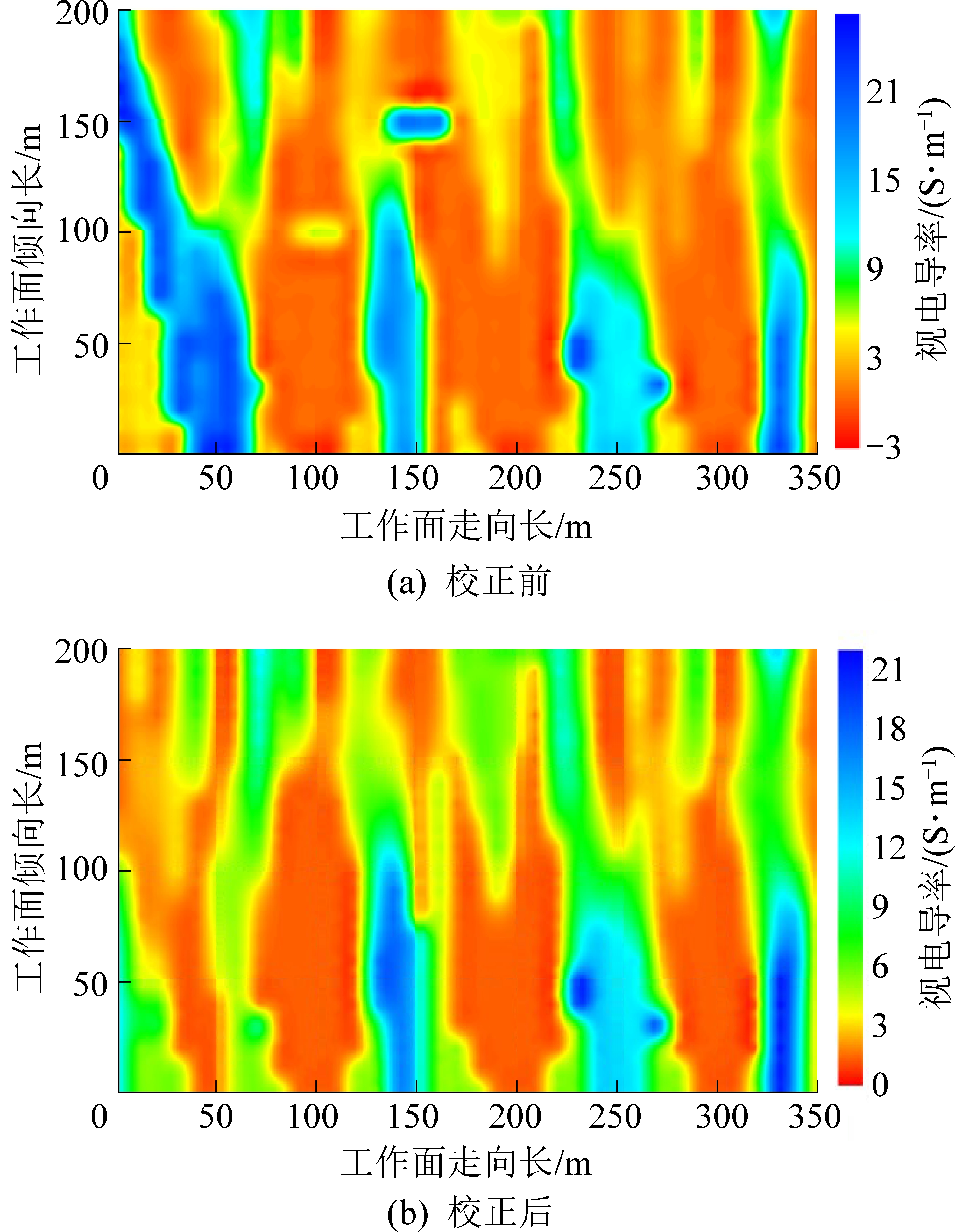 经过校正前后的对比,可以看出校正后数据质量良好,利用校正后数据绘制巷道探测结果,本次探测工作面宽度为200 m,探测工作面长度为350 m。探测校正前后对比如图11所示。由图11a与图11b对比可以看出,由于发射电极附近低阻干扰体影响,导致采样电位数据整体偏移,使探测成果图发生整体视电导率畸变。由于接收电极附近干扰体影响,视电导率拟断面图中数据误差引起数据严重畸变,测点间存在浅部低阻干扰体影响造成畸变。