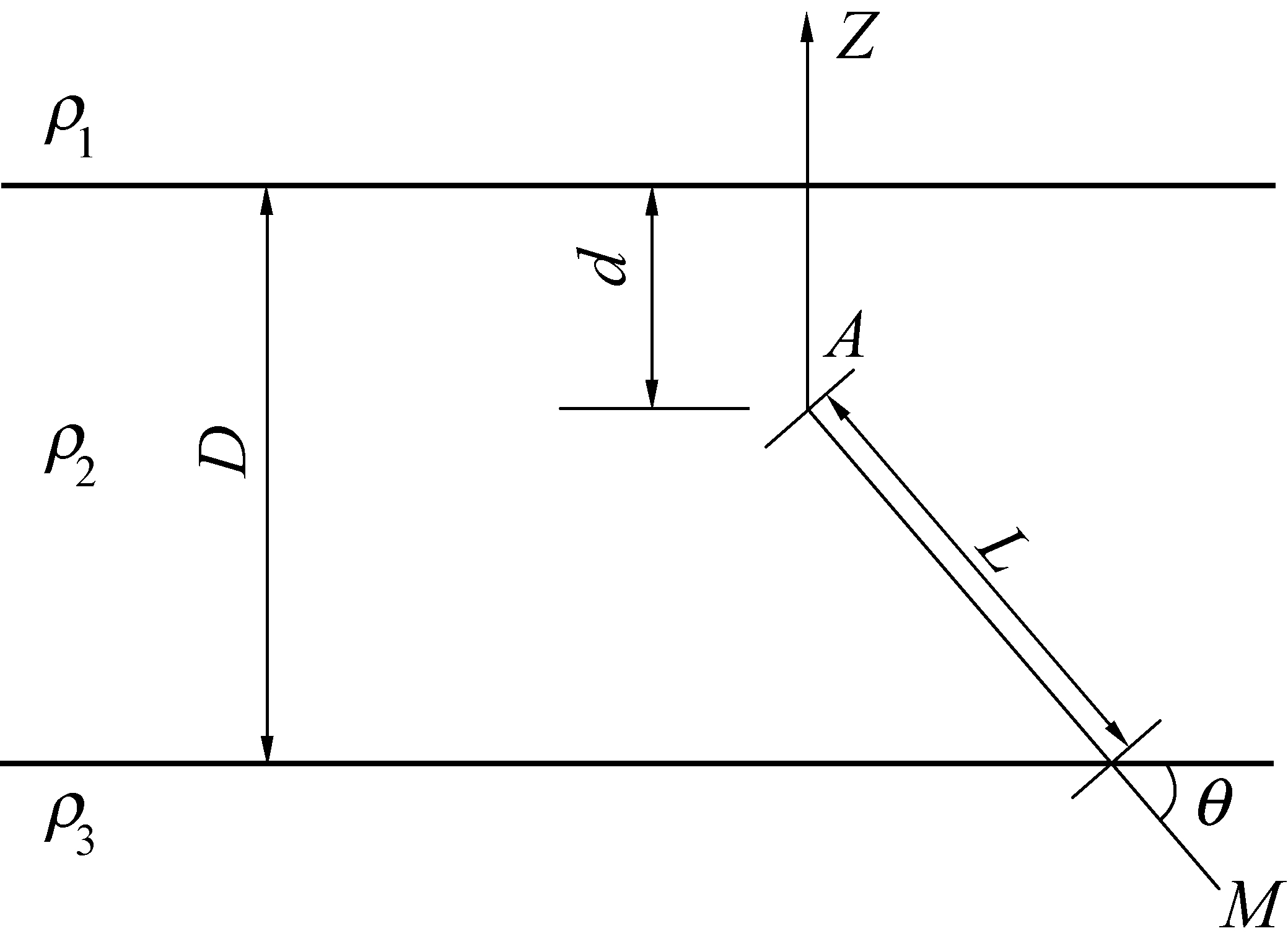 煤层顶、底板一般由泥岩,砂岩组成,因此,矿井工作面内的煤层与巷道顶、底板电性不同,煤层相对顶、底板为高阻层。根据煤层及其顶、底板岩性视电阻率特征建立三层地电模型,如图1所示。