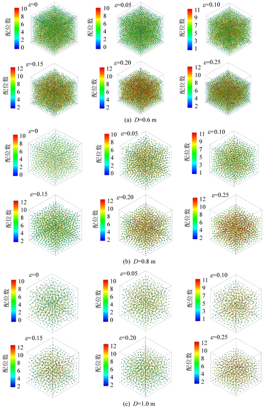 垮落岩体内某一岩块可能与周围一个或多个岩块相互接触,配位数为目标岩块与周围岩块接触的个数,平均配位数为垮落岩体内岩块的总配位数与岩块数量的比值,配位数则在细观尺度下表征垮落岩体的密实程度[24-25]。外部载荷作用下,垮落岩体内应力通过岩块间的接触网络进行传递,岩块的配位数体现了垮落岩体细观结构的密实程度,岩块配位数越大,垮落岩体内传递应力的接触网络就越密集。垮落岩体内岩块配位数的演化过程如图4所示。由图4可知:当垮落岩体轴向应变ε=0时,垮落岩体内的岩块以青色为主,其中直径为0.8 m的岩块组成的岩体的平均配位数为5.1,随轴向应变的增大,垮落岩体内岩块间接触力增大,岩块间的连接网络越来越密实,使岩块的配位数也逐渐增大。当垮落岩体轴向应变为ε=0.25时,垮落岩体内的岩块以红色为主,直径为0.8 m的岩块组成的岩体的平均配位数达7.8。