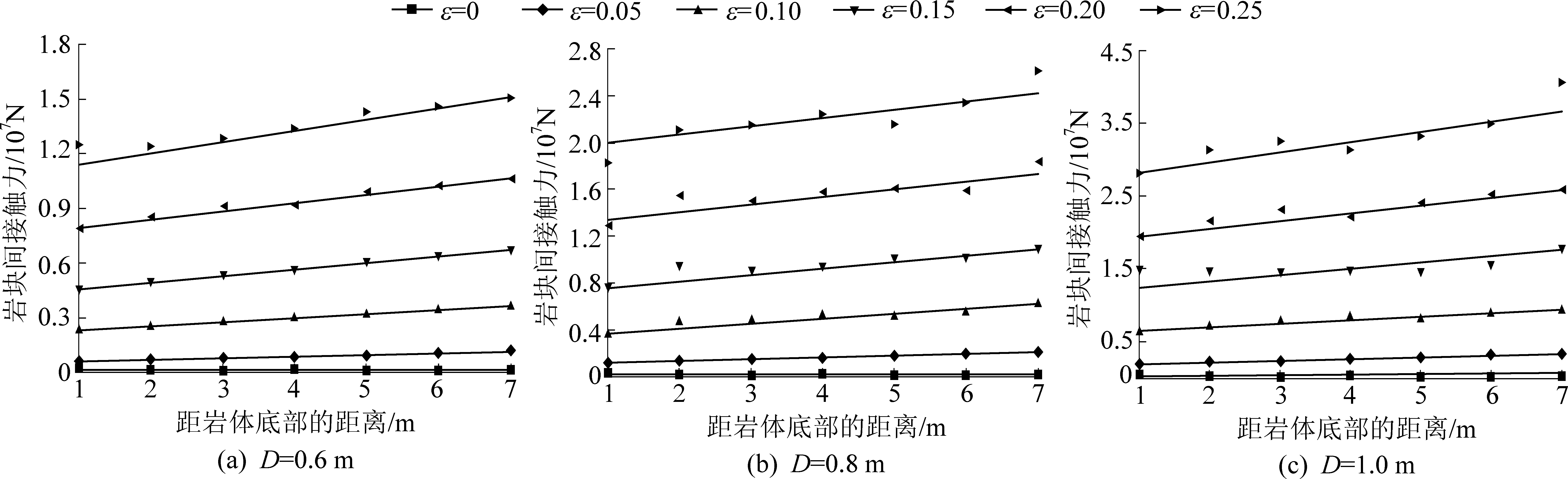 将垮落岩体自下而上每1 m划分为一个单元,由于垮落岩体压缩25%后的高度为7.5 m,因此在此仅分析7 m高的垮落岩体内岩块间平均接触力,如图3所示。由图3可知:由于外部载荷难以自岩体顶部的受力端均匀的传递到岩体底部,使垮落岩体上部岩块受外部载荷扰动较大,导致垮落岩体内岩块间接触力自下而上整体呈上升趋势。岩体轴向应变从0增加到0.25过程中,由于岩块间的挤压和摩擦作用增强,导致岩块间的接触力也不断增大。