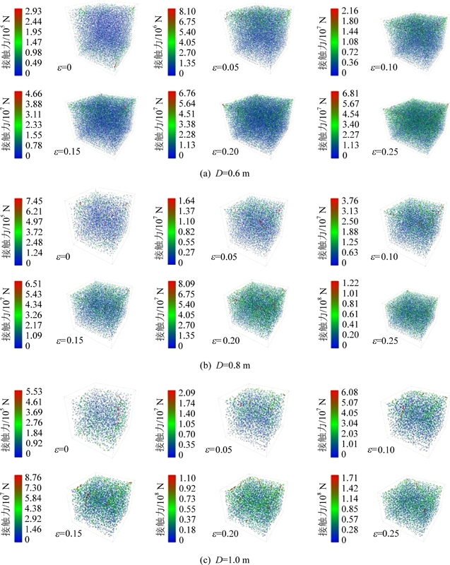 岩块间接触力演化云图如2所示。由图2可知:随垮落岩体轴向应变的增大,岩块间的接触力不断增大。当垮落岩体的轴向应变为ε=0时,垮落岩体以蓝色区域为主,岩块间的接触力较小。当垮落岩体轴向应变为ε=0.05时,由于外部载荷无法从垮落岩体顶部的受力端均匀地传递到岩体下部,使仅在垮落岩体上部出现小范围绿色区域,而垮落岩体的中下部仍以蓝色区域为主,表明垮落岩体上部岩块间的接触力要大于中下部。随轴向应变的增大,垮落岩体上部绿色区域不断向下部延展,岩块间接触力较大的区域自垮落岩体上部向下不断扩展。