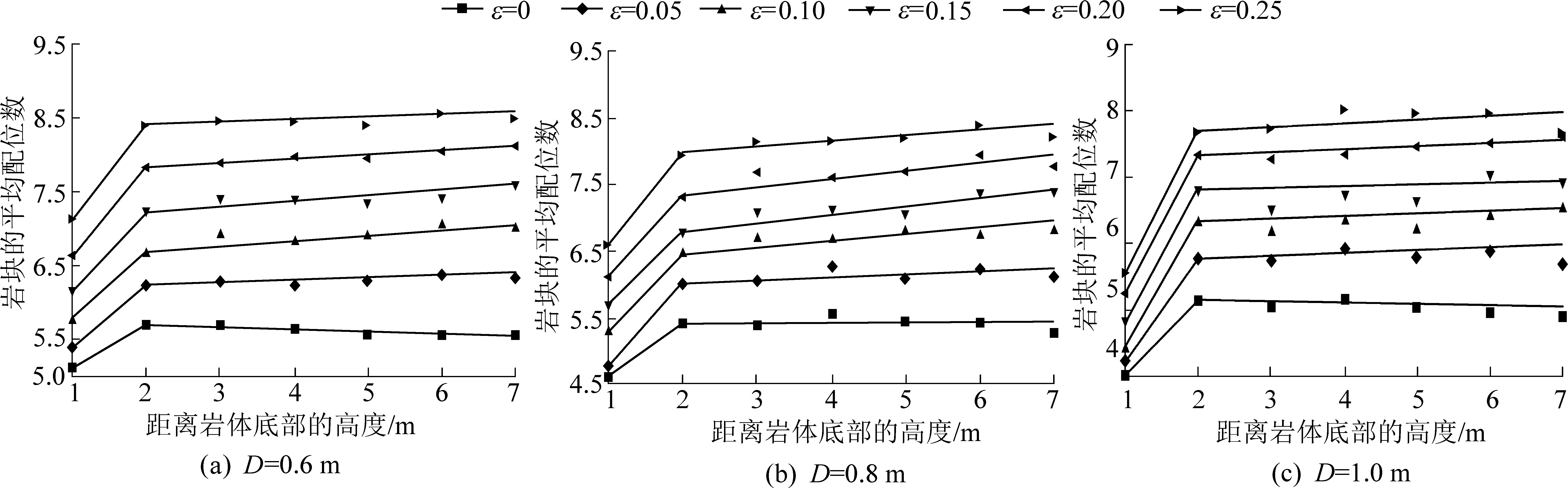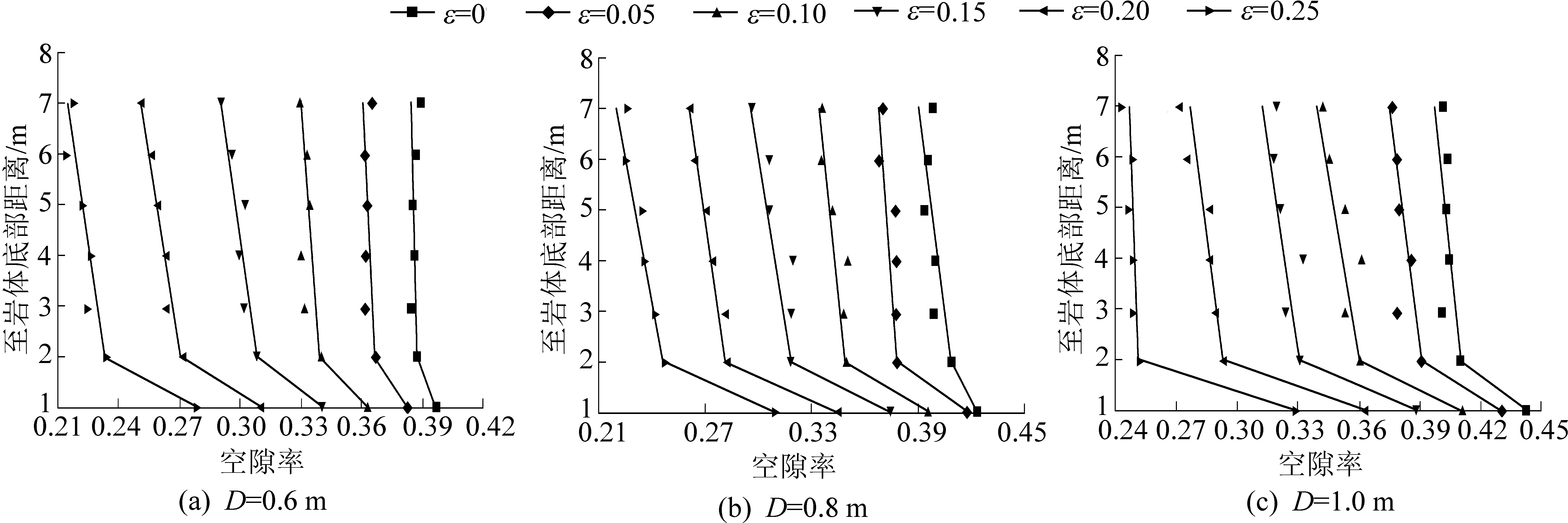 不同层位垮落岩体空隙率的分布如图7所示。由图7可知:相同轴向应变下,垮落岩体空隙率自下向上先快速降低,随后缓慢降低,其中自垮落岩体底部向上2 m范围岩体的空隙率最大。以D=0.8 m的岩块组成的垮落岩体为例,当轴向应变为0时,垮落岩体底部空隙率是上部空隙率的1.1倍。由于垮落岩体下部岩块受到外部载荷扰动较小,岩块堆积较松散,导致轴向应变越大,垮落岩体上下层位空隙率的差值会越大,当岩体轴向应变为0.25时,岩体底部空隙率是上部空隙率的1.4倍。