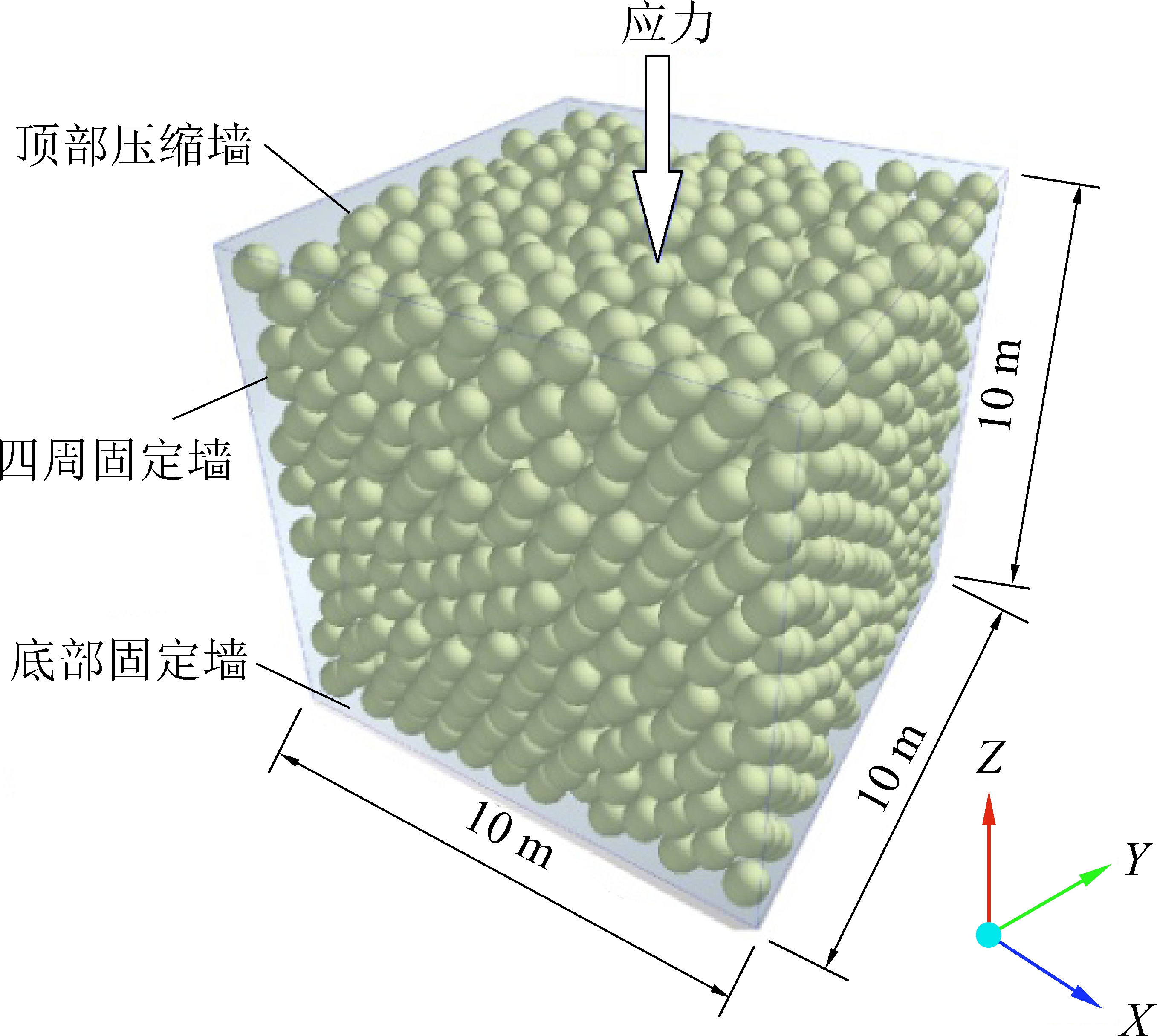 以山西霍州煤电李雅庄矿2-607工作面采空区为原型,其中2-607工作面采空区垮落带的高度约为10 m。由于2-607工作面采空区的长度与宽度较大,将采空区抽象为10 m × 10 m × 10 m的垮落岩体单元,模拟采空区上覆岩层作用下,采空区不同位置垮落岩体的受力状态,如图1所示。