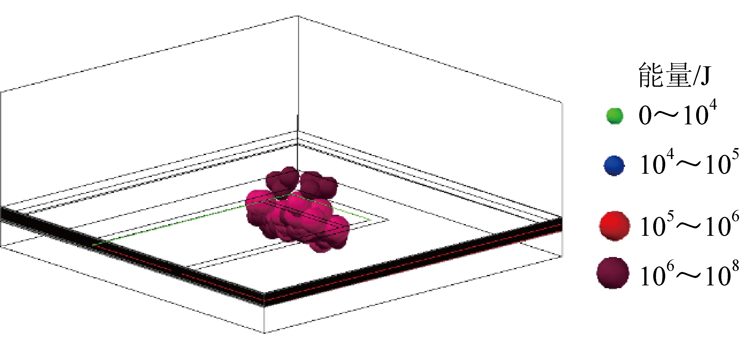 图6为不同单次开挖量和单次时步组合下能量调整平衡过程中的弹性能演化规律,记录了每隔5时步能量调整后释放的最大单元弹性能事件,其更具代表性,紫色震源球代表最高能量。可以看出,震源最先分布在开采区域的顶底板周围,随着单次时步延长,伴随着能量场由近及远的传递,弹性能事件逐步向顶板深处发展,与实际采场周围顶板能量转移活动较为吻合。