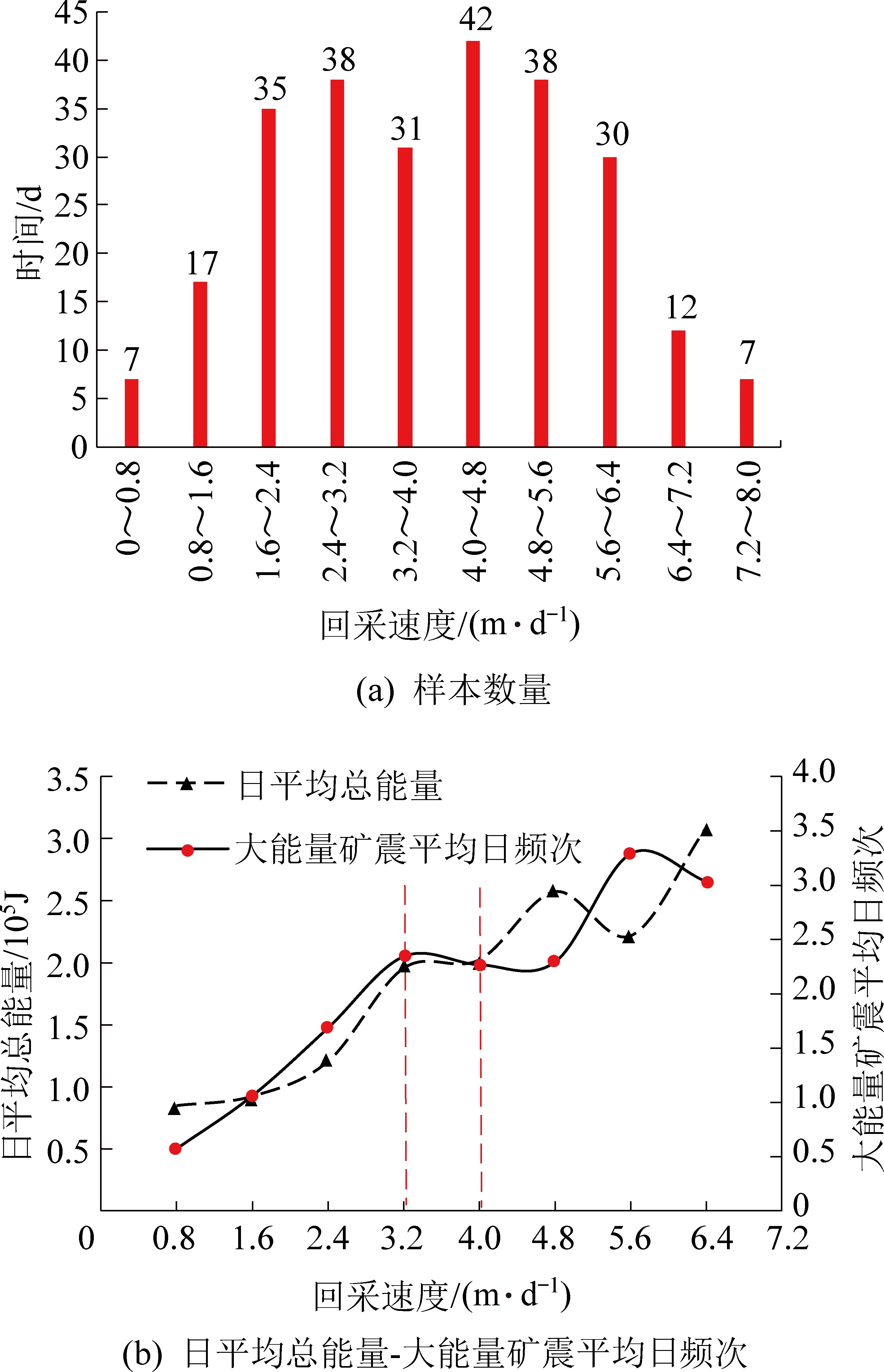 即回采速度越快,采场围岩释放的大能量矿震越多,促使低能级矿震向高能级矿震跃升,最终造成大能量矿震所占比例增大。能量集聚区距离采场开挖区更近,不易往深处转移,连续快速开挖容易造成采场能量集中释放,诱发冲击地压。