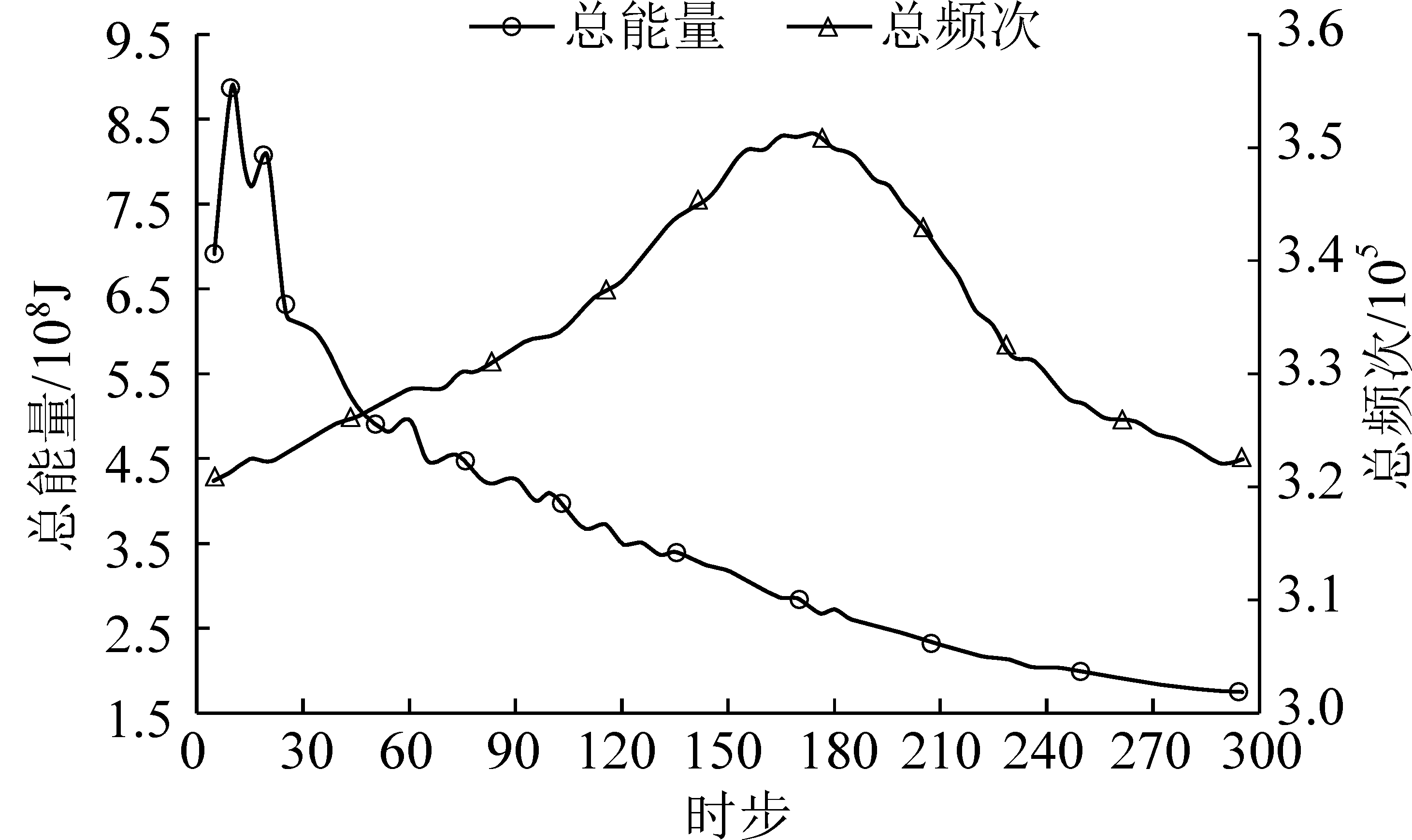 在单个平衡周期内(以单次开挖量2 m,单次300时步为例),如图3所示,在开挖平衡初期,采场围岩释放的总能量最大,随时步的延长,采场围岩释放的总弹性能呈现先急剧升高后逐渐减低的趋势;矿震的频次呈现先升高后降低的趋势,在开挖后180时步左右达到频次峰值,说明采场围岩单元的应力调整具有滞后性,即单次开挖后采场围岩需要时间来调整区域应力集中。