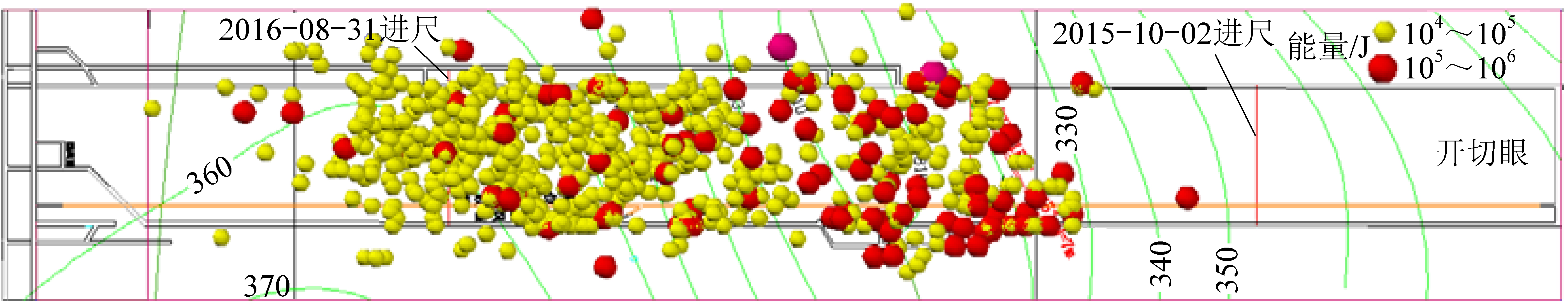 矿震分布是对开采活动的实时响应,通过分析不同回采速度下矿震分布的能量时序特征,便可揭示开采活动对采场围岩冲击危险的影响,以胡家河矿402103工作面为例进行分析。依据综合指数法评价402103工作面整体为强冲击危险,采用多因素耦合法分区分级得到冲击危险评价结果如图7所示(红色为强冲击危险,蓝色为中等冲击危险,黄色为弱冲击危险)。工作面2015-10-02日至2016-08-31日的微震事件(能量大于104 J)如图8所示,所统计区域大部分属于中等或强冲击危险区域。