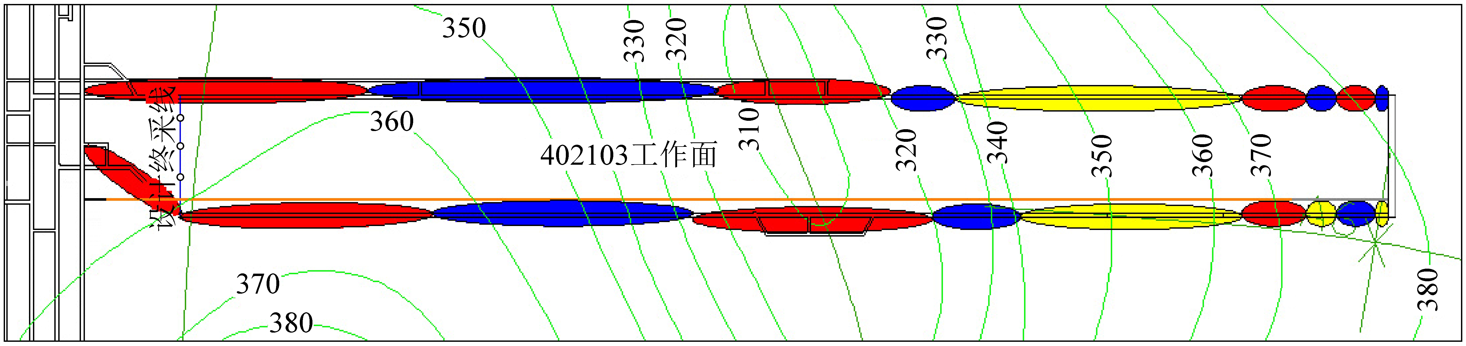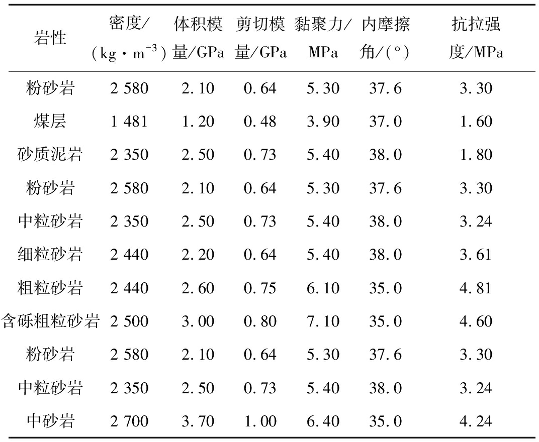 岩性密度/(kg·m-3)体积模量/GPa剪切模量/GPa黏聚力/MPa内摩擦角/(°)抗拉强度/MPa粉砂岩2 5802.100.645.3037.63.30煤层1 4811.200.483.9037.01.60砂质泥岩2 3502.500.735.4038.01.80粉砂岩2 5802.100.645.3037.63.30中粒砂岩2 3502.500.735.4038.03.24细粒砂岩2 4402.200.645.4038.03.61粗粒砂岩2 4402.600.756.1035.04.81含砾粗粒砂岩2 5003.000.807.1035.04.60粉砂岩2 5802.100.645.3037.63.30中粒砂岩2 3502.500.735.4038.03.24中砂岩2 7003.701.006.4035.04.24