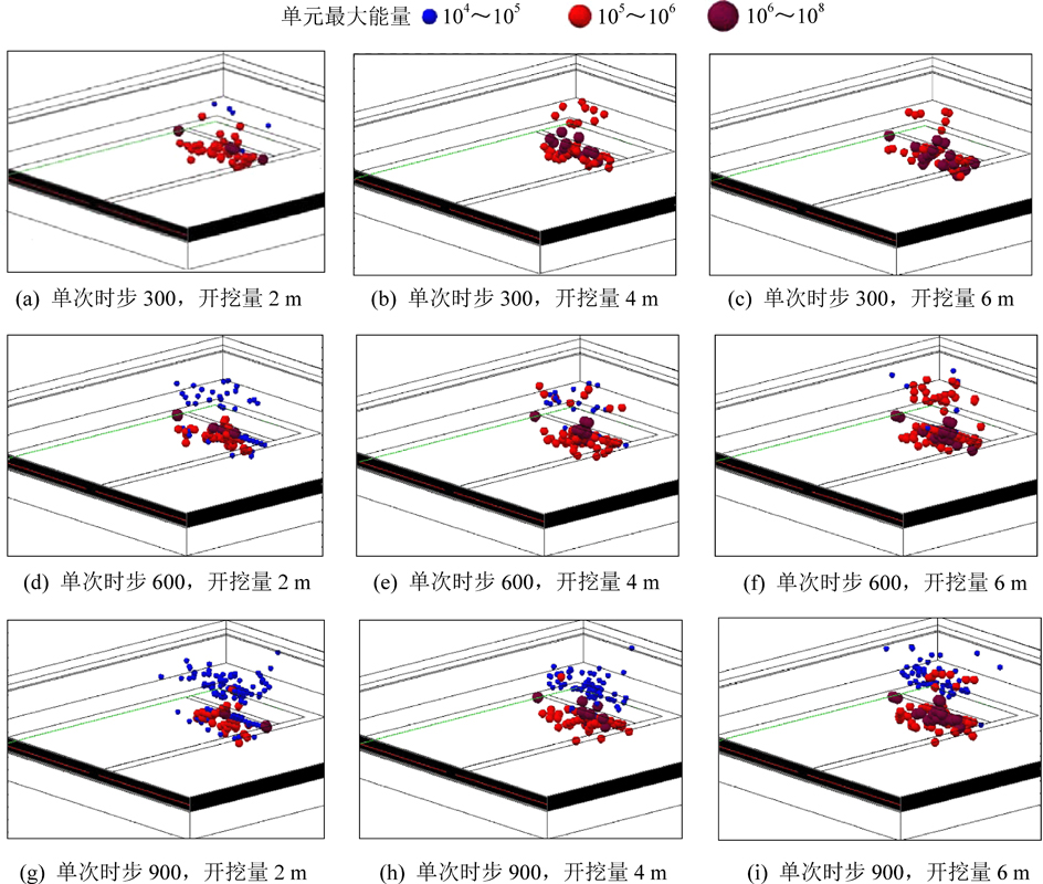 当单次时步相同时,单次开挖量越大,产生的大能量事件越多;当单次开挖量相同时,单次时步越短,产生的大能量事件越多,采场能量由近及远调整的越不充分,连续开挖过程中能量更容易积聚甚至不均匀释放。