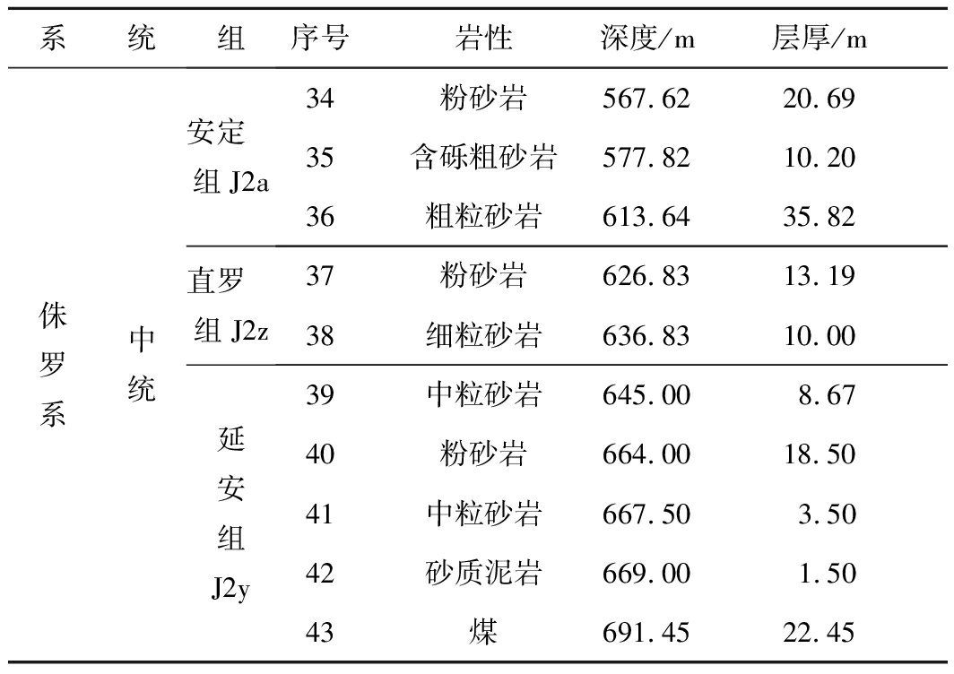 系统组序号岩性深度/m层厚/m侏罗系中统安定 组J2a34粉砂岩567.6220.6935含砾粗砂岩577.8210.2036粗粒砂岩613.6435.82直罗 组J2z37粉砂岩626.8313.1938细粒砂岩636.8310.00延安组J2y39中粒砂岩645.008.6740粉砂岩664.0018.5041中粒砂岩667.503.5042砂质泥岩669.001.5043煤691.4522.45