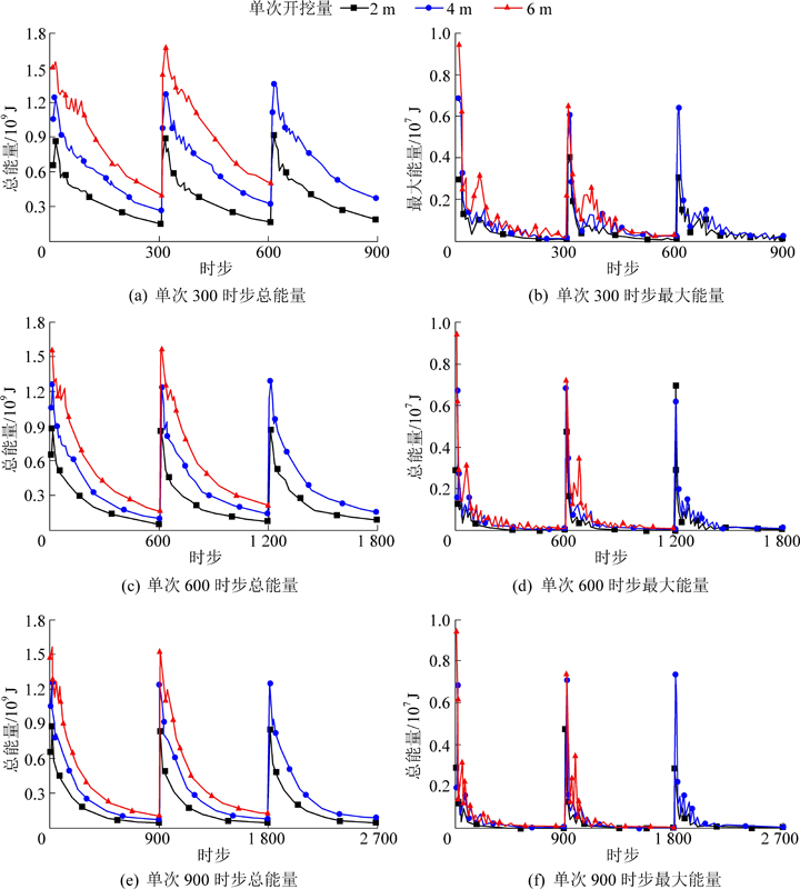 单次时步相同,开挖量不同时采场围岩释放的总能量和最大能量时序分布如图5所示。由模型总能量随回采速度的变化曲线得知,单次开挖量6 m的总能量峰值1.6×109 J大于单次开挖量4 m时的1.3×109 J大于单次开挖量2 m时的9.0×108 J,说明时步相同时,单次开挖量越大,单位时步内释放的总能量越大,其中峰值尤其明显。