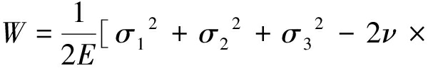 依据表1钻孔柱状建立FLAC3D三维模型,模型长600 m×宽600 m×高216 m,共划分750 000个三维单元。兼顾计算效率,模型四周施加水平约束,底部边界固定,顶部设为自由边界。模型最上岩层埋深约为560 m,施加14 MPa的垂直载荷,采用摩尔-库伦本构模型,力学参数见表2。FLAC3D单元体中储存的弹性应变能W可由式(1)计算[17]。