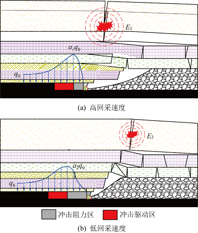 冲击地压是由煤岩体能量集中释放造成的,其主要根源为覆岩运动载荷,但破坏场所在开挖煤层空间内。因此宜从顶板运动载荷和煤层应力2方面阐述回采速度的影响。