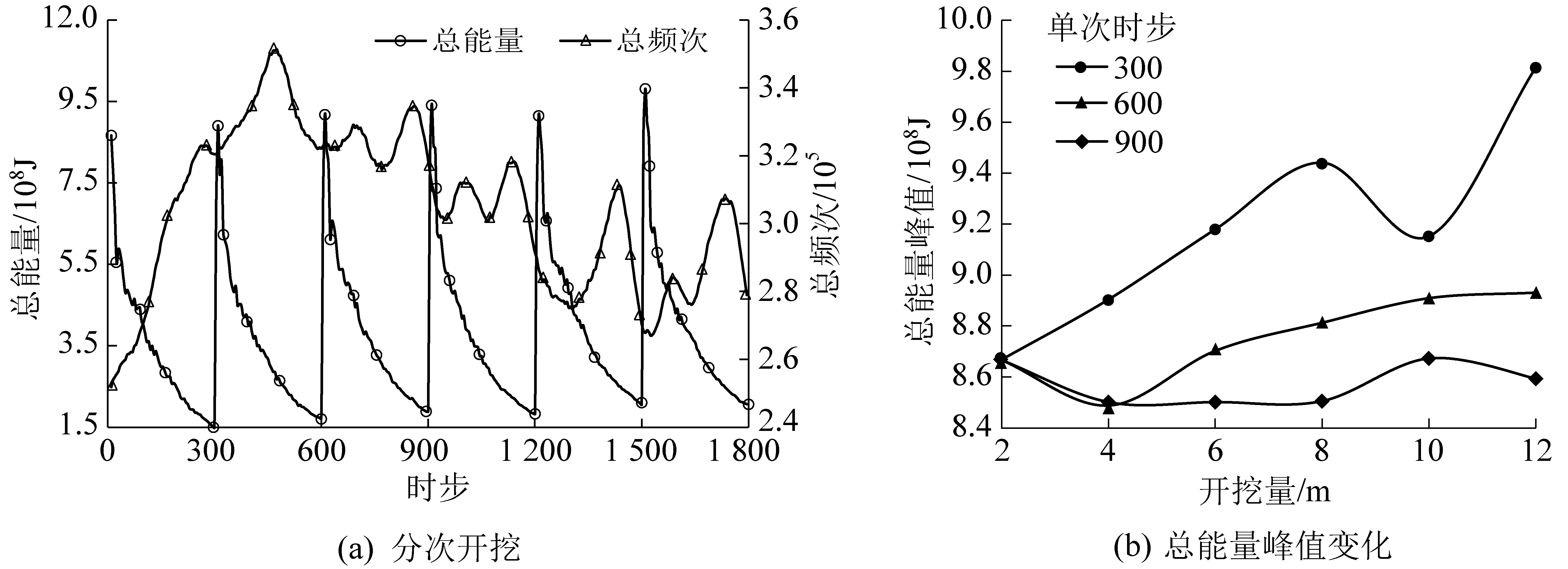 图4为单次开挖量2 m时连续开挖-平衡-开挖-平衡过程中的矿震总能量、总频次的时序曲线。采场围岩释放的总能量、频次处于周期性波动过程中,结合图4b,当单次时步为300和600时,总能量峰值随开挖量的增加而增大,单次时步为900时,总能量峰值随开挖量的增加而减小;且单次开挖量相同,单次时步越小,采场释放的总能量峰值越高,证明了采场围岩能量积聚水平具有累积效应。