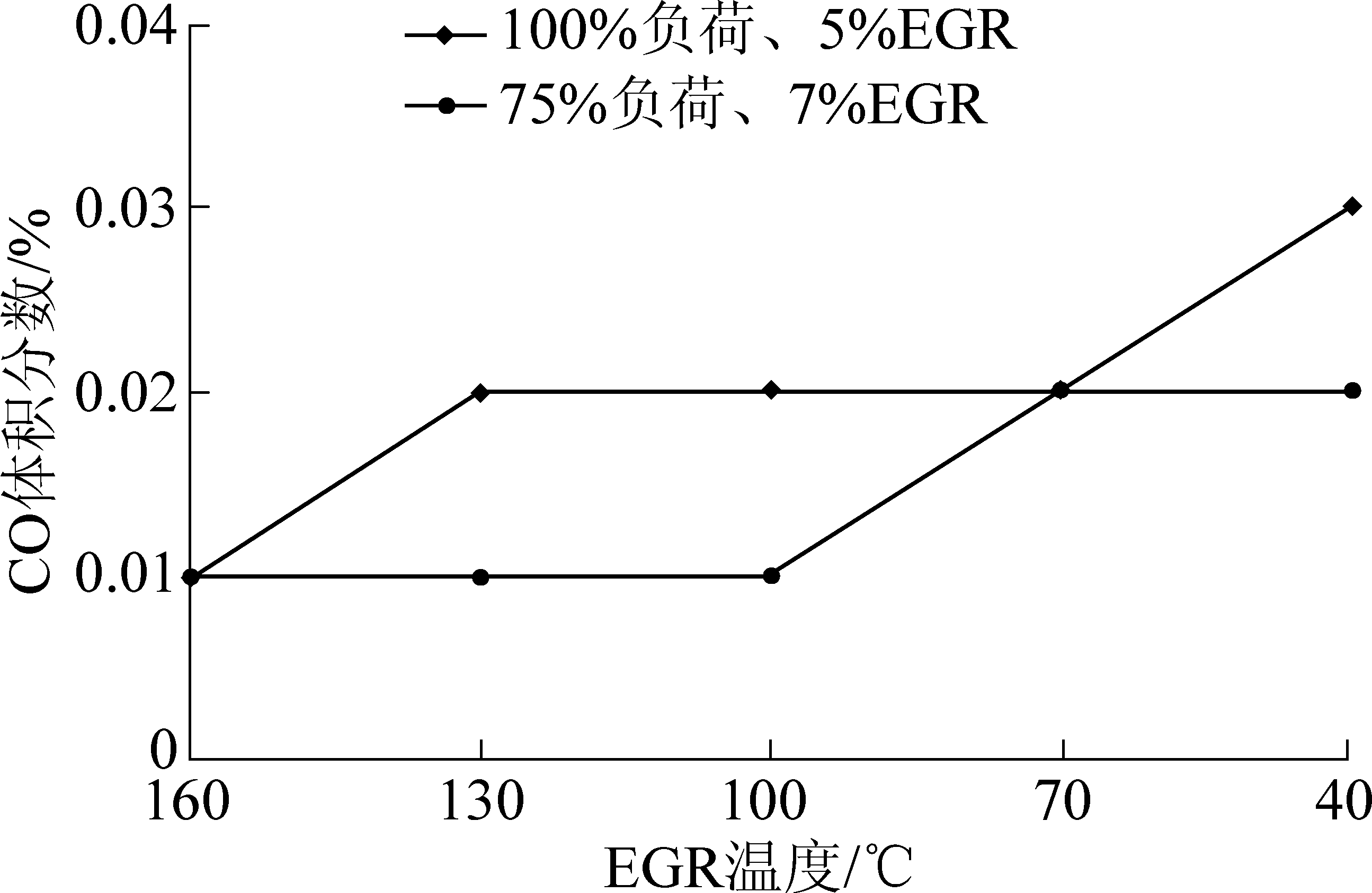 防爆柴油机不同负荷下EGR温度对CO排放的影响曲线如图6所示。从图6可以看出:①在额定转速下随着EGR温度的降低CO排放反而增加;②在同一EGR温度下,负荷降低,CO排放也低;③CO排放在100%负荷下,在160~130 ℃时增幅最大,在75%负荷下,在100~70 ℃时增幅最大。这说明当EGR温度降低时,缸内燃烧温度降低,CO反而增加。