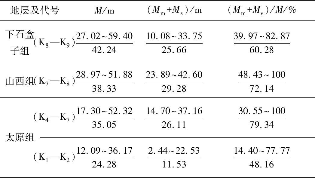 地层及代号M/m(Mm+Ms)/m(Mm+Ms)/M/%下石盒子组(K8—K9)27.02~59.4042.2410.08~33.7525.6639.97~82.8760.28山西组(K7—K8)28.97~51.8838.3323.89~42.6029.2848.43~10072.14太原组(K4—K7)17.30~52.3235.0514.70~37.1626.1130.55~10079.34(K1—K2)12.09~36.1724.282.44~22.5311.5314.40~77.7748.16